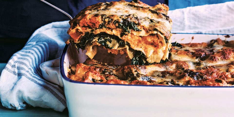 6. Zeit zum Schichten! Eine große ofenfeste Form bereitstellen. Eine Schicht Kürbismischung hineingeben. Mit Lasagneblättern bedecken. Darauf eine Lage Spinat schichten, diese mit einer großzügigen Menge Parmesan bestreuen. Darauf wieder Lasagneblätter legen und mit Kürbismischung bedecken. Auf diese kommen wieder Lasagneblätter. Zum Schluss die restliche Kürbismischung und den restlichen Spinat daraufgeben. Diese Schicht mit Mozzarellascheiben belegen und mit dem restlichen Parmesan bestreuen. Mit etwas Olivenöl beträufeln und großzügig mit Pfeffer würzen. Die Lasagne im heißen Ofen etwa 45 Minuten backen, bis die Oberfläche goldbraun ist.