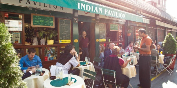 Der Wiener Naschmarkt ist bekannt für seine kulinarische Vielfalt, denn neben den Marktständen kann sich der hungrige Einkäufer in den unzähligen Restaurants und an den Ständen einmal um die Welt essen. Authentische, indische Küche bietet das kleine Restaurant Indian Pavilion. Ein mit Liebe und Gastfreundschaft geführter Familienbetrieb; die Eigentümer haben sich zur Priorität gesetzt, die Vielfalt ihrer heimischen Küche nach Österreich zu transportieren. Das ist gelungen! Denn neben diversen typischen indischen Curries – von mild bis scharf – und hausgemachten Chutneys gibt es jeden Tag wahlweise drei Tagesgerichte, eines davon vegetarisch. Sehr empfehlenswert sind auch die Linsenknödel in Joghurtsoße (Dahi Vada) und die Teigtaschen Khasta
