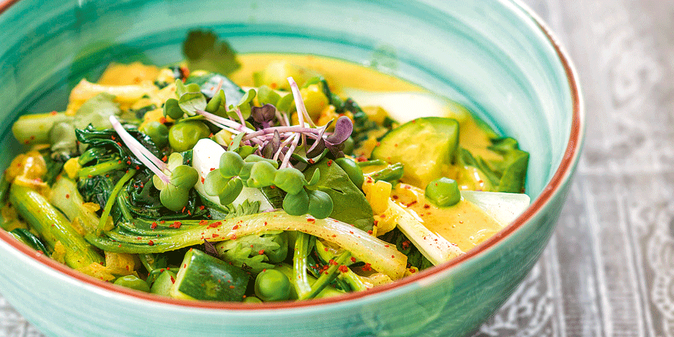 Zutaten 4 Baby-Pak Choi, 2 Zucchini 4 Frühlingszwiebeln 2 Zwiebeln, 2 Knoblauchzehen 2–3 cm Ingwer, 2 EL Pflanzenöl 1 kleine rote Chilischote 1 TL Kurkuma, gemahlen 1 TL Kreuzkümmel, gemahlen 1 TL Korianderpulver, gemahlen 600 ml Kokosmilch, 400 g Erbsen 1 Handvoll Koriandergrün Meersalz, 1–2 EL Limettensaft Chiliflocken, zum Bestreuen bunte Kresse, zum Garnieren (rot und grün)