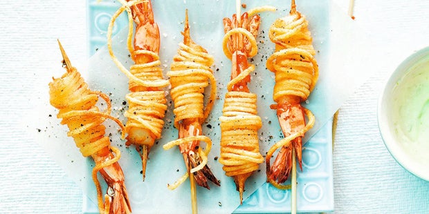 20 Riesengarnelen, küchenfertig entdarmt und bis auf das Schwanzsegment geschält Pflanzenöl, zum Frittieren Zubereitung 1. Die Erdäpfel schälen, waschen und mit dem Spaghetti-Schneider in feine Spaghetti schneiden. In einer Schüssel mit kaltem Wasser waschen, anschließend sehr gut trocken tupfen. 2. Die Garnelen abbrausen und trocken tupfen. Auf Holzspieße stecken, salzen, pfeffern und jeweils mit Erdäpfel-Spaghetti umwickeln. Im heißen Öl (ca. 170 °C) portionsweise je ca. 5 Minuten goldbraun frittieren. Auf Küchenpapier abtropfen lassen. Nach Belieben im Ofen (bei 70 °C) warm halten bis alle Garnelen ausgebacken sind. Mit Salz und Pfeffer gewürzt servieren. Dazu passt ein Knoblauch-Dip. |