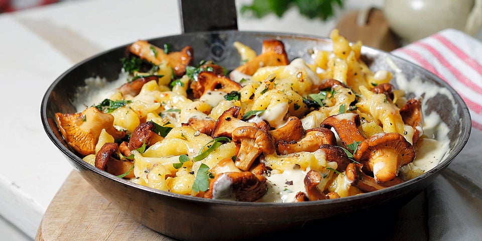5. Die Spätzle in die Pfanne geben, durch Schwenken mit den Pilzen vermischen und heiß werden lassen. Die Crème fraîche einrühren und mit Salz und Pfeffer abschmecken.