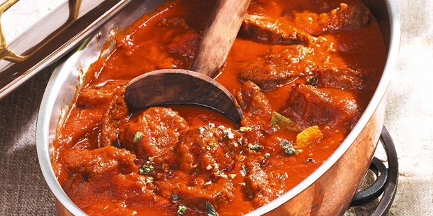 Dauer: 3 h 25 min Schwierigkeit: leicht Portionen: 4 Zutaten 1 kg Rindfleisch, pariert z. B. Schulter oder Wade 5 Zwiebeln 1 Knoblauchzehe 2–3 EL Pflanzenöl 2 EL Tomatenmark 400 g stückige Tomaten, Dose ca. 500 ml Fleischfond 1 unbehandelte Zitrone 1 rote Chilischote, 1 TL Kümmel 1 EL Paprikapulver, edelsüß 1 EL frisch gehackter Majoran 1 Lorbeerblatt, Salz, Pfeffer Zubereitung 1. Das abgebrauste Fleisch trocken tupfen und würfeln. Die Zwiebeln schälen, halbieren und in Streifen schneiden. 2. Das Öl in einen großen, heißen Topf geben die Fleischwürfel zufügen und scharf anbraten. Zwiebeln kurz mitbraten. Tomatenmark unterrühren, kurz mitschwitzen, dann die Tomaten und so viel Fond angießen, dass alles gut bedeckt ist. Etwa 2,5 Stunden unter gelegentlichem Rühren knapp unter dem Siedepunkt leise köcheln lassen. Nach Bedarf noch etwas Fond zufügen. 3. Währenddessen den Knoblauch schälen und fein hacken. Die heiß gewaschene Zitrone trocken reiben und die Schale dünn abschneiden. Die Chilischote waschen, halbieren, putzen und fein hacken. Alles zusammen mit dem Kümmel, Paprikapulver, Majoran und Lorbeerblatt während der letzten ca. 20 Minuten zum Gulasch geben. Mit Salz und Pfeffer abschmecken und servieren. |