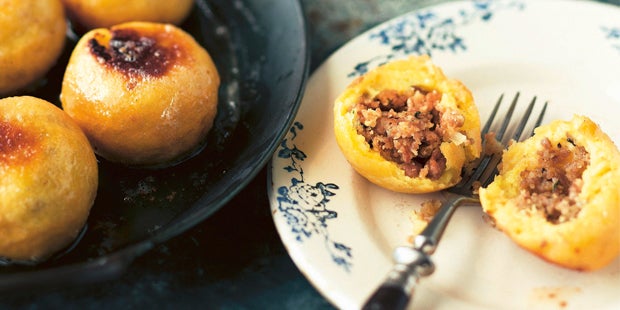 Für die Knödel: 600 g mehlig kochende Erdäpfel, Salz, ca. 100 g Mehl 1 Ei, 1 Eidotter, Muskat ca. 100 g Butterschmalz Für die Füllung: 500 g Schweinfleisch, aus der Keule 1 EL Kronenöl, 1 Zwiebel 1 Knoblauchzehe, 1 Ei 2–3 EL Semmelbrösel 1 EL frisch gehackter Thymian Salz, Pfeffer, aus der Mühle