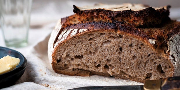 ca. 750 g Roggenvollkornmehl Zubereitung 1. 400 g vom Mehl mit 600 ml lauwarmem Wasser und dem Sauerteig in einer Schüssel gut verrühren. Abgedeckt an einem warmen Ort ca. 4 Stunden stehen lassen. Anschließend das übrige Mehl und das Salz zugeben und alles gut verkneten. So lange kneten, bis der Teig eine feste, formbare Konsistenz hat (etwa 10 Minuten), nach Bedarf noch Mehl ergänzen. Erneut in einer Schüssel abgedeckt ca. 1 Stunde ruhen lassen. Dann den Teig auf bemehlter Arbeitsfläche gut durchkneten und zu einem Laib formen. Gut bemehlen und in einen Gärkorb legen. Abgedeckt weitere 30 Minuten ruhen lassen. 2. Den Ofen auf 240 °C Ober- und Unterhitze vorheizen. Ein feuerfestes Schälchen mit Wasser mit in den Ofen stellen. 3. Das Brot vorsichtig aus dem Körbchen auf ein mit Backpapier belegtes Backblech stürzen. Im unteren Drittel im Ofen ca. 10 Minuten anbacken. Das Wasser wieder herausnehmen und die Temperatur auf 200 °C herunterschalten. Das Brot 60–70 Minuten fertig backen. Wenn sich das Brot beim Klopfen auf die Unterseite hohl anhört, ist es fertig, ansonsten weitere 5–10 Minuten backen und den Klopftest wiederholen. |