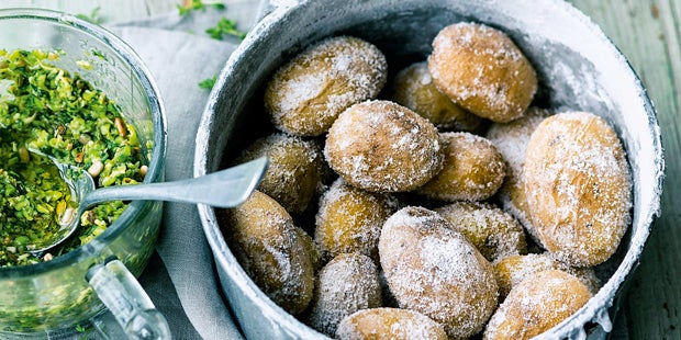 Erdäpfel-Pizzette mit gebratenem Löwenzahn-Pesto (12 Stück)