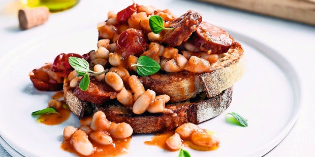 Dauer: 20 min Schwierigkeit: leicht Portionen: 4 Zutaten 200 g Chorizo 1 Zwiebel 1 Knoblauchzehe 100 ml Geflügelfond 200 g Kirschparadeiser, Dose 600 g weiße Bohnen, Dose 1–2 TL Sherryessig Salz 1 Prise Zucker Pfeffer, aus der Mühle 8 Scheiben Weißbrot 2 EL Olivenöl Oreganoblätter, zum Garnieren Zubereitung 1. Die Wurst in Scheiben schneiden. Die Zwiebel mit dem Knoblauch schälen und fein würfeln. Zusammen mit der Wurst in einem Topf 1–2 Minuten anschwitzen. Mit der Brühe ablöschen. 2. Die Paradeiser zugeben. Die Bohnen in einem Sieb gut abtropfen lassen und ebenfalls mit in den Topf geben. Etwa 8 Minuten leicht dicklich einköcheln lassen und mit Essig, Salz, Zucker und Pfeffer abschmecken. 3. Die Brotscheiben knusprig rösten, mit dem Öl beträufeln und auf Tellern anrichten. Die Bohnen darüber geben und mit Oregano garniert servieren. |