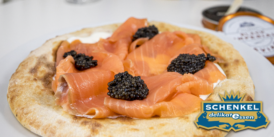 - Die Pizza anschließend mit dem Nordischen Räucherlachs von Schenkel belegen und jede Scheibe Lachs mit einem Löffel Black Imperial Caviar von Schenkel toppen
