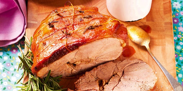 Zubereitung 1. Das Fleisch waschen, trocken tupfen, salzen, pfeffern und mit Küchengarn in Form binden. Die Fettschicht mehrfach mit einem scharfen Messer einritzen und mit Rosmarinnadeln spicken. 2. Das Öl mit dem Ketchup, Tomatenmark, Orangensaft, Gewürzen, Senf und Worcestershiresauce verrühren. Den Backofen auf 120°C Ober- und Unterhitze vorheizen. 3. Das Fleisch in einer heißen Pfanne rundherum anbraten, mit dem Tomatenöl einstreichen und auf dem Gitter im Ofen (darunter Fettpfanne) ca. 1,5 Stunden garen. Dabei immer wieder mit dem Öl einpinseln. 4. Für den Salat die Gurke waschen, Enden abschneiden, schälen, der Länge nach vierteln und in schmale Scheiben schneiden. Die Tomaten waschen, von dem Stielansatz befreien und in schmale Spalten schneiden. Die Kichererbsen über einem Sieb abbrausen und gut abtropfen lassen. Den Feta in kleine Würfel schneiden. Die Minze waschen, trocken schütteln und die Blätter abzupfen. Die Hälfte der Minzblätter fein hacken. Für die Vinaigrette den Zitronensaft mit dem Essig und Öl verrühren und mit Salz und Pfeffer abschmecken. 5. Alle Salatzutaten mit der Vinaigrette mischen, abschmecken, in Schälchen anrichten, mit Pfeffer übermahlen und mit den übrigen Minzblättern garnieren. 6. Die Lammkeule aus dem Ofen nehmen, von dem Küchengarn befreien, in Scheiben schneiden und mit dem restlichen Gewürzöl servieren.