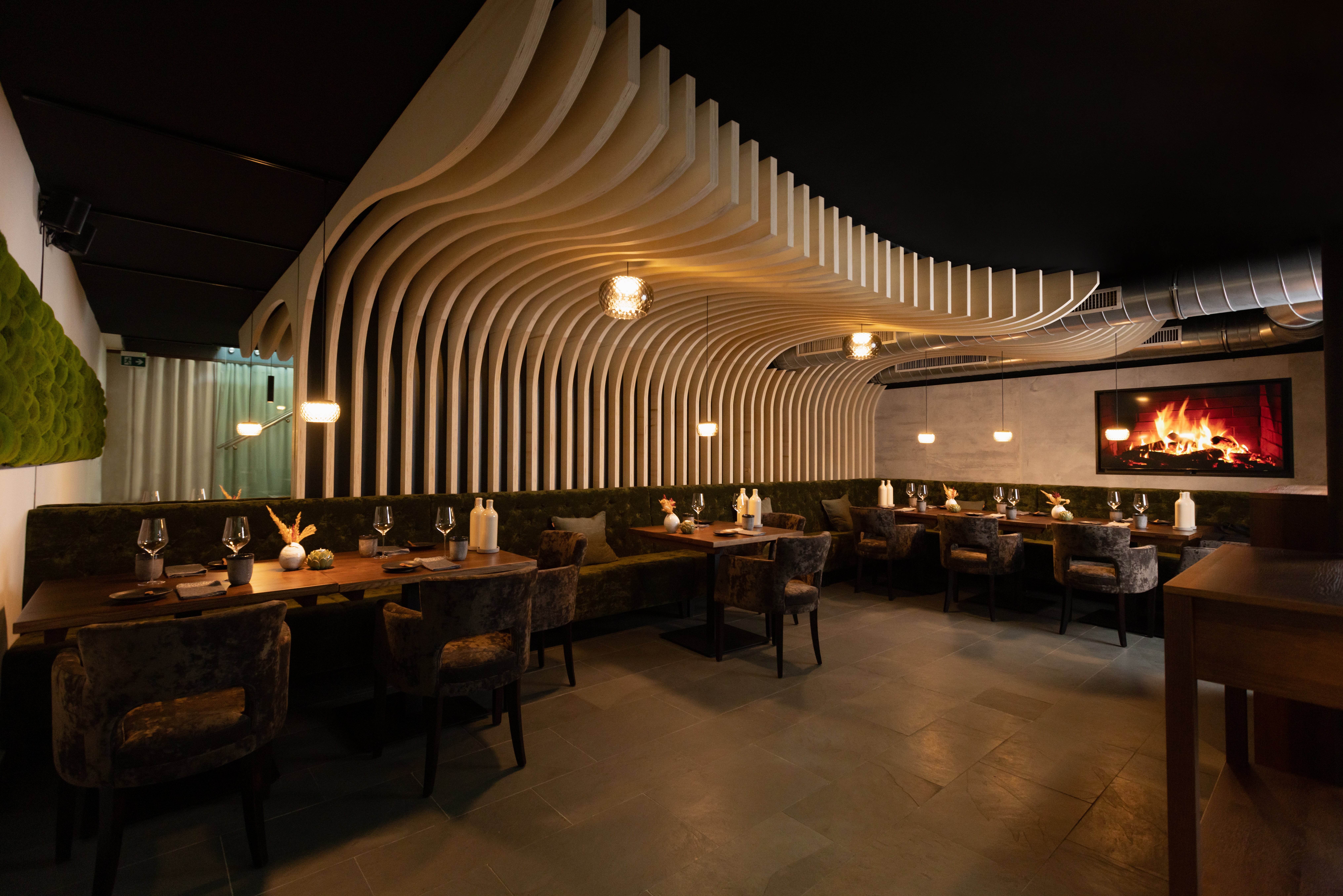 Diese Geschichte bringt Schmuck ab sofort in zwei Menüs auf die Teller. Die große Variante "Terra" umfasst sieben Teller, die kleinere Variante heißt "Vega" und hat fünf Teller im Aufgebot - beide Versionen des Menüs werden umrandet von zahlreichen kleinen Gerichten und Happen. Verwurzelt. Auch architektonisch nimmt das neue Restaurant Bezug auf die Natur. Das geschwungene Deckenelement aus Holz symbolisiert die dynamischen Veränderungen der Natur. Aus einem Teil der Wände wächst Moos, und die zwölf Sitzplätze des Restaurants können organisch verschoben werden und verschmelzen dabei stets mit der Lichtinstallation über ihnen.