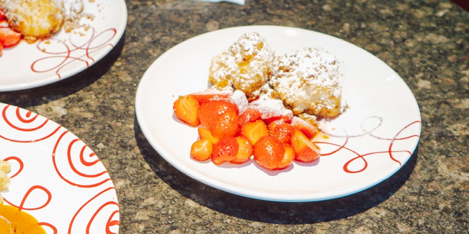 Feine Topfenknödel, umhüllt von goldbraunen Zuckerbröseln, serviert mit fruchtigem Erdbeerröster. Süß, saftig und ein unwiderstehlicher Genussmoment.