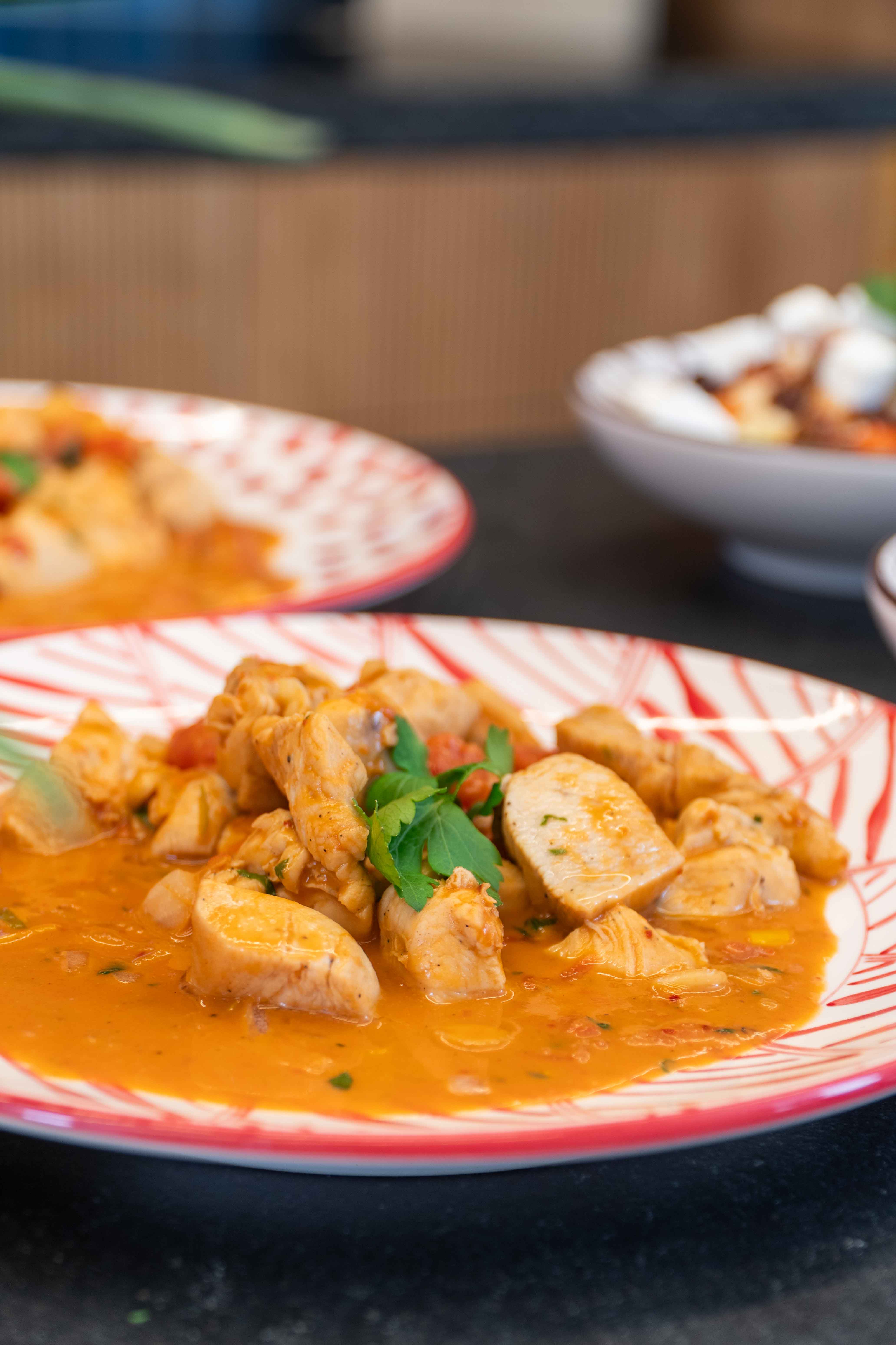 Köcheln lassen: Die angebratenen Hähnchenwürfel wieder in die Sauce geben. Alles ohne Deckel bei mittlerer Hitze etwa 20 Minuten sanft köcheln lassen. Zwischendurch umrühren.