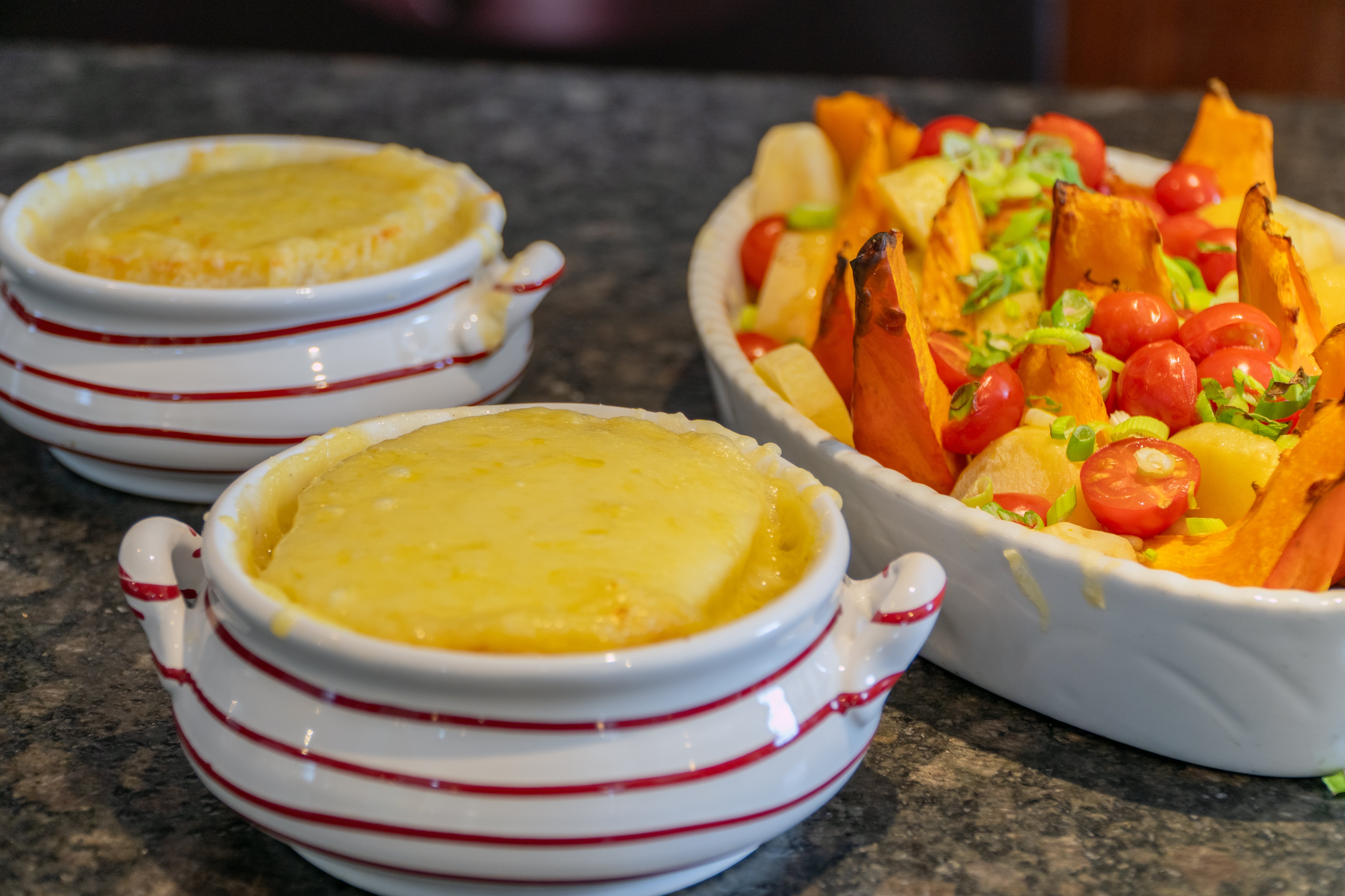 - Weißbrotscheiben in einer Pfanne mit Butter beidseitig kräftig rösten, eine feuerfeste Form damit auslegen, Suppe darübergießen und geriebenen Käse darüberstreuen. Im vorgeheizten Backrohr bei 230 °C Umluft auf der obersten Schiene backen, bis der Käse goldbraun ist. Sofort servieren.