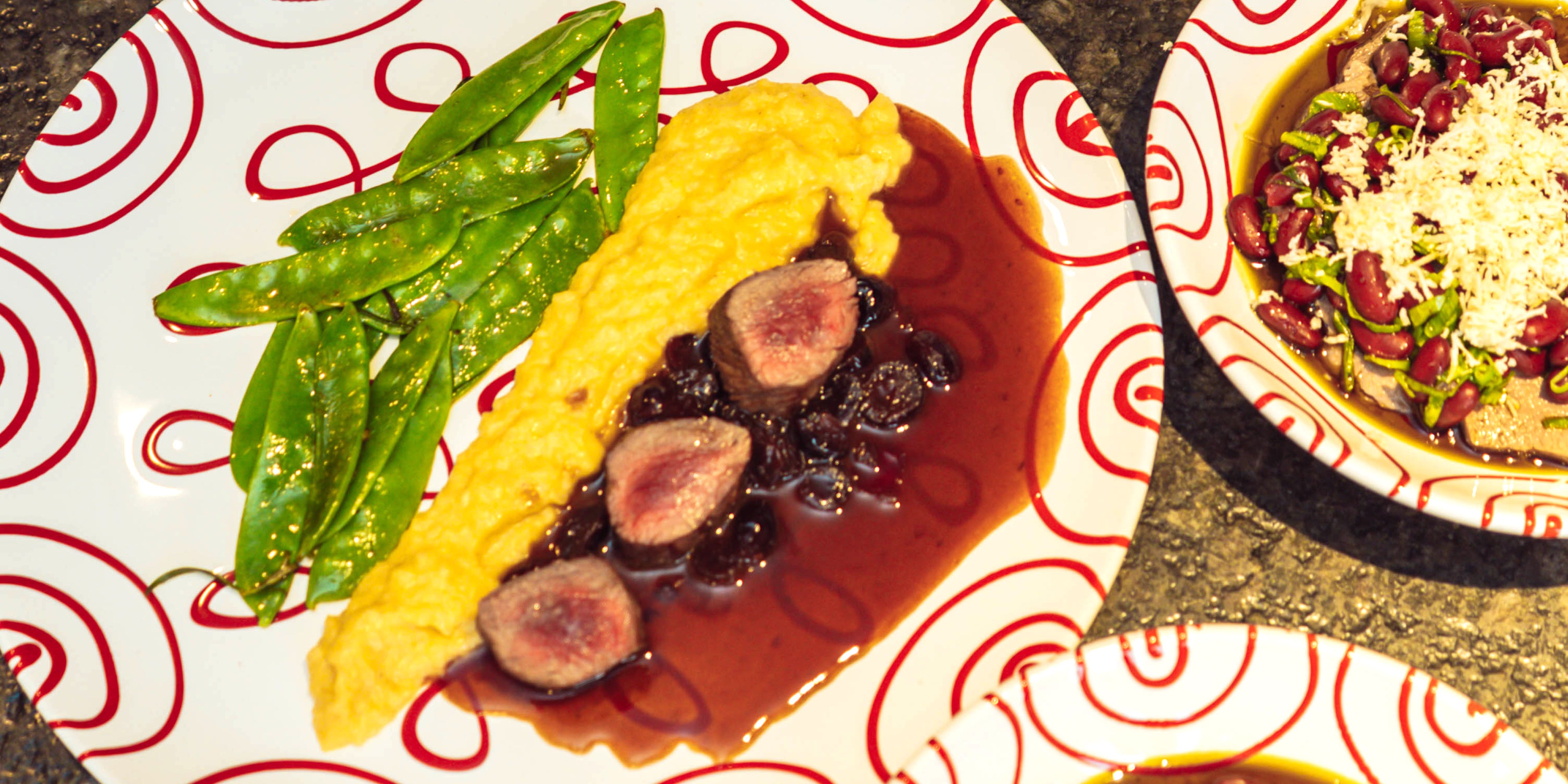 Zart gegrillter Rehrücken trifft auf cremiges Erdäpfel-Sellerie-Püree, frische Zuckererbsenschoten und eine fruchtig-herbe Cranberrysauce – eine elegante Verbindung von Wildaromen und feiner Süße. Dieses Gericht vereint rustikale Bodenständigkeit mit festlicher Raffinesse für besondere Anlässe.