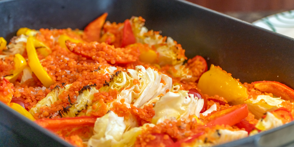 Eine Ofenform mit roten Linsen ausstreuen. Zwiebel, Paprikawürfel und Kirschparadeiser in der Form verteilen. 100 ml Wasser zugießen. Krautviertel und Thymianzweig daraufsetzen, salzen, pfeffern und mit Olivenöl beträufeln. Im vorgeheizten Rohr bei 160°C Umluft 30 – 35 Minuten weich braten.