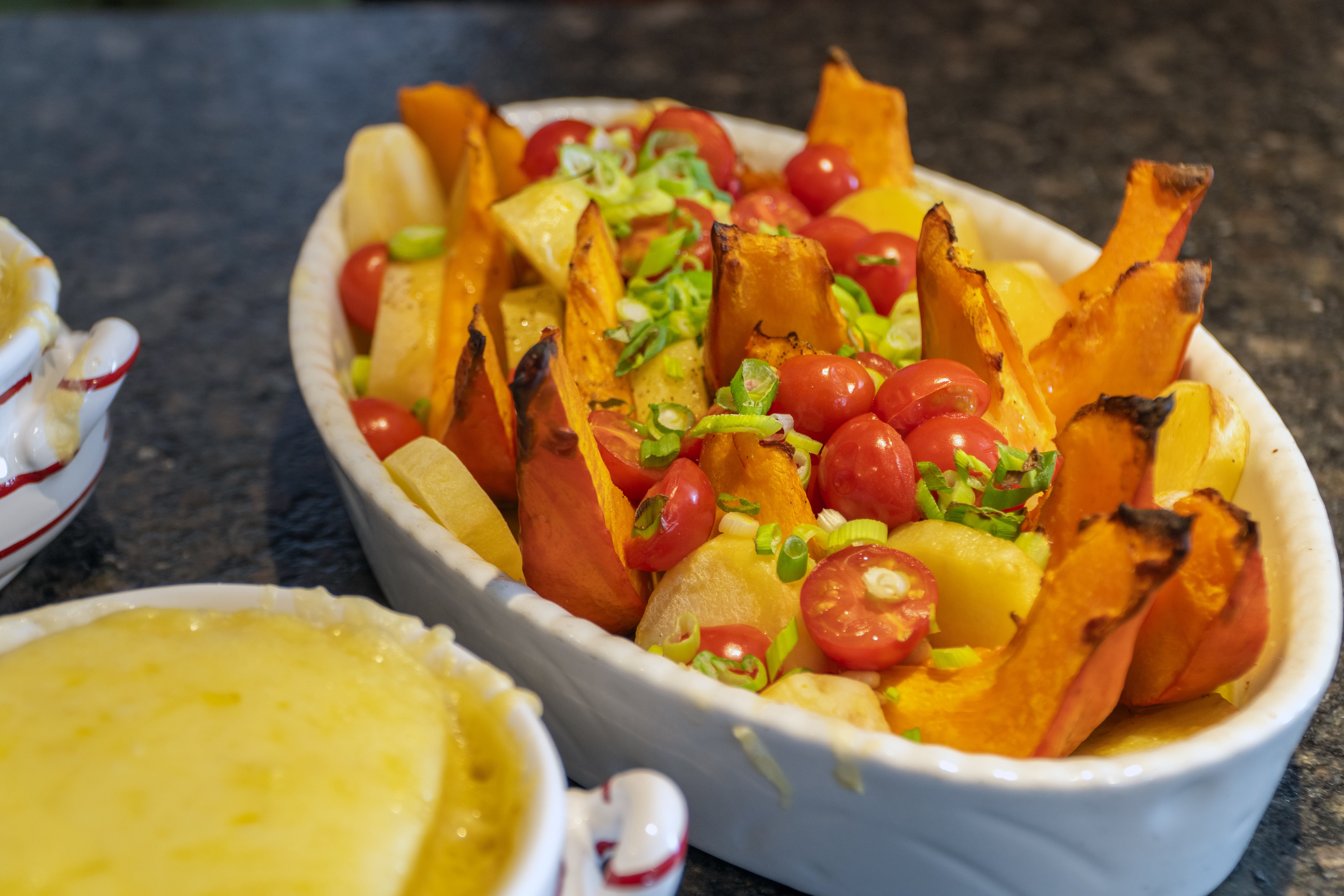 - Währenddessen die Jungzwiebeln in feine Ringe schneiden, die Kirschparadeiser halbieren. Zu den Erdäpfel- und Kürbisspalten geben und alles gemeinsam weitere 20 Minuten backen lassen.