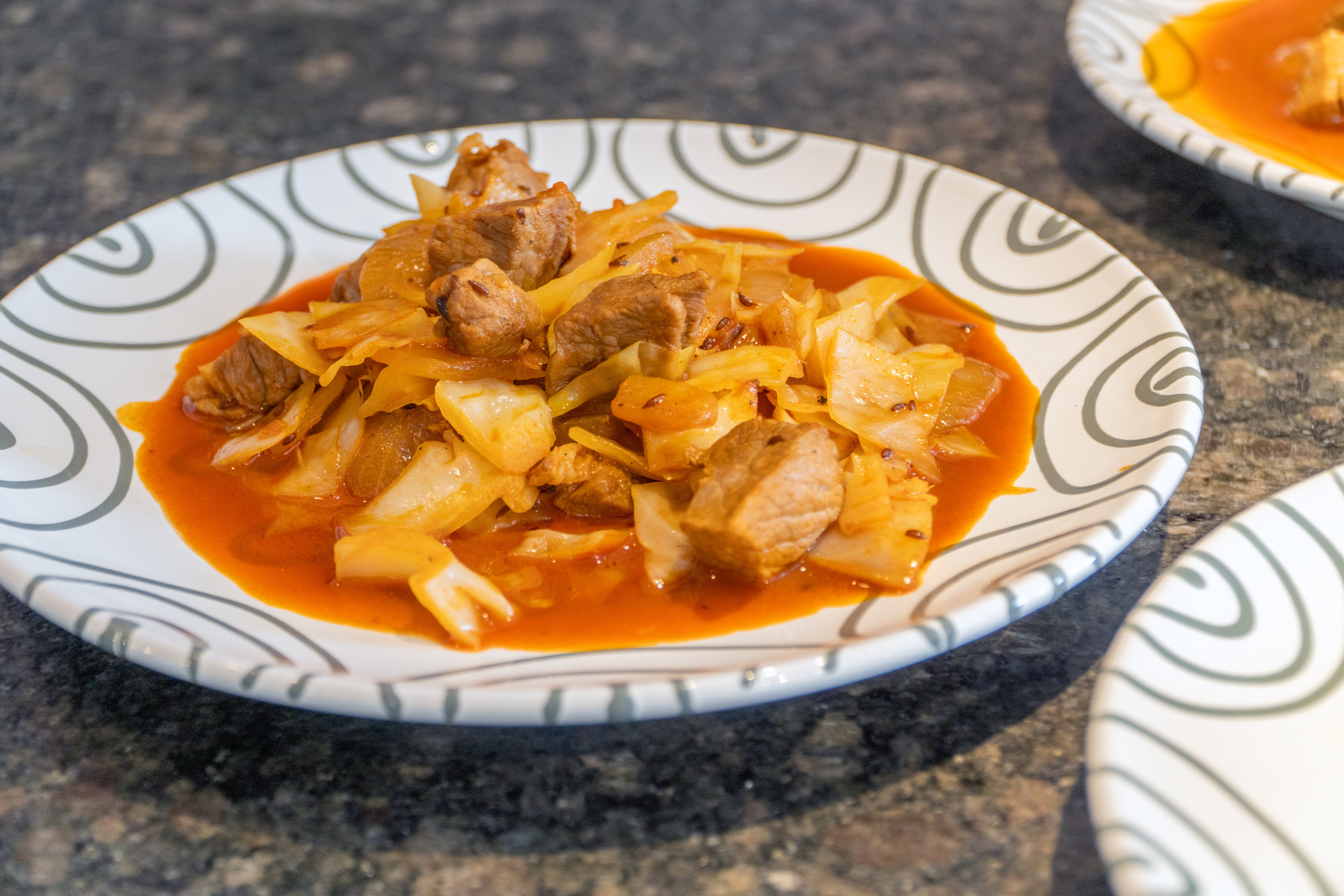- Honig in einem großen Topf erwärmen, Ingwer und Chili anrösten, Zwiebeln und Knoblauch dazugeben und weiter rösten. Weißkraut mitrösten, Paprikapulver einrühren und kurz mitrösten. Mit Mehl stauben, mit Grünem Veltliner ablöschen und mit Wasser aufgießen. Kümmel und Fleisch dazugeben. Ca. 1 ½ Stunden köcheln lassen. Mit Salz und Pfeffer würzen.