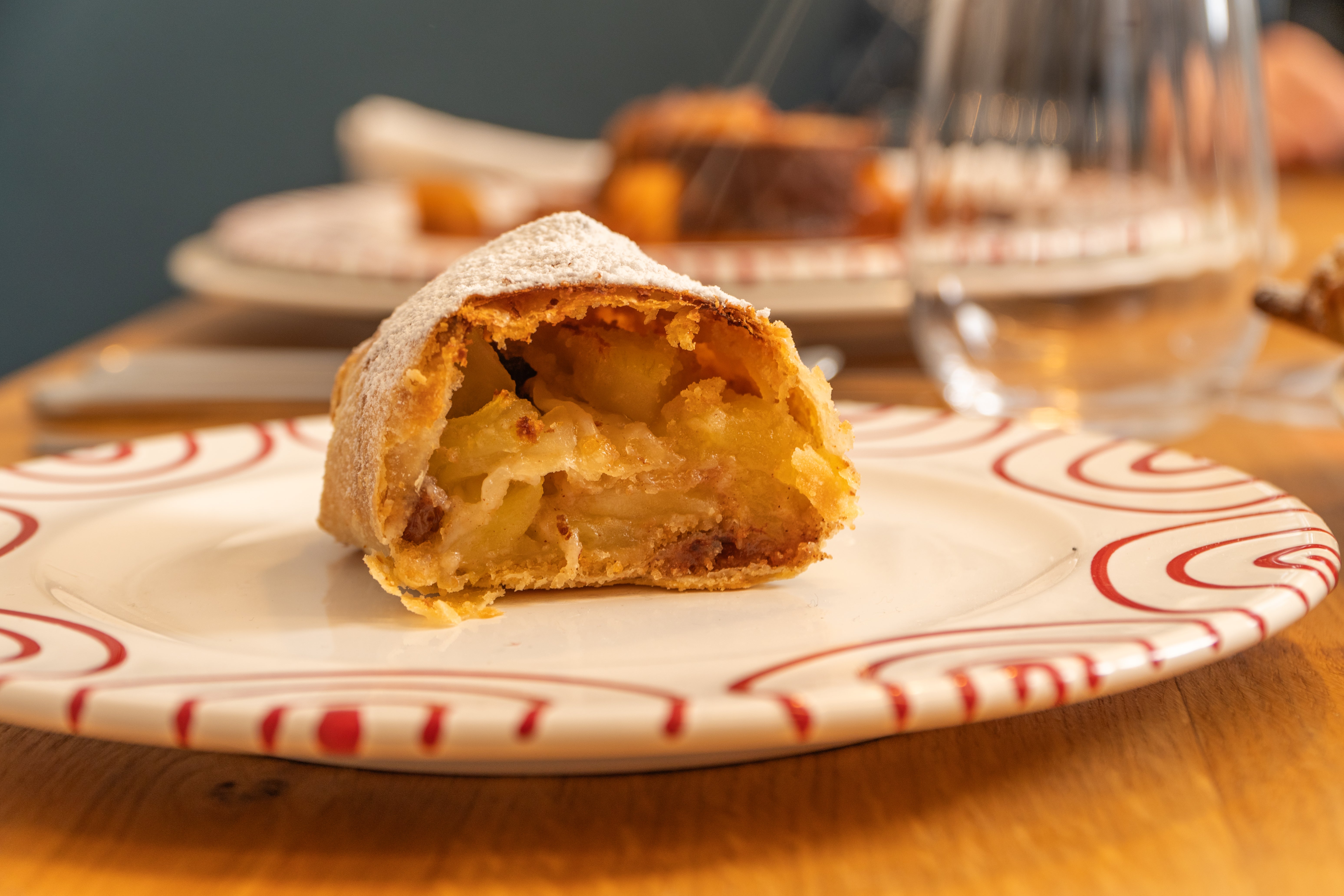Ein echtes Stück Wiener Mehlspeiskultur. Hauchdünner Strudelteig umhüllt eine saftige Apfelfülle mit Zimt, Rosinen und feiner Zitronennote. Klassisch serviert, am besten noch warm und mit Staubzucker bestreut.