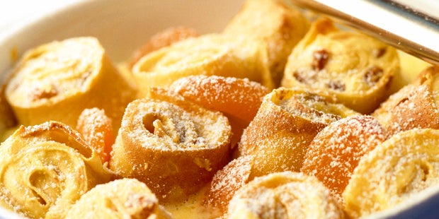 Überbackene Palatschinkenröllchen mit Topfenfüllung