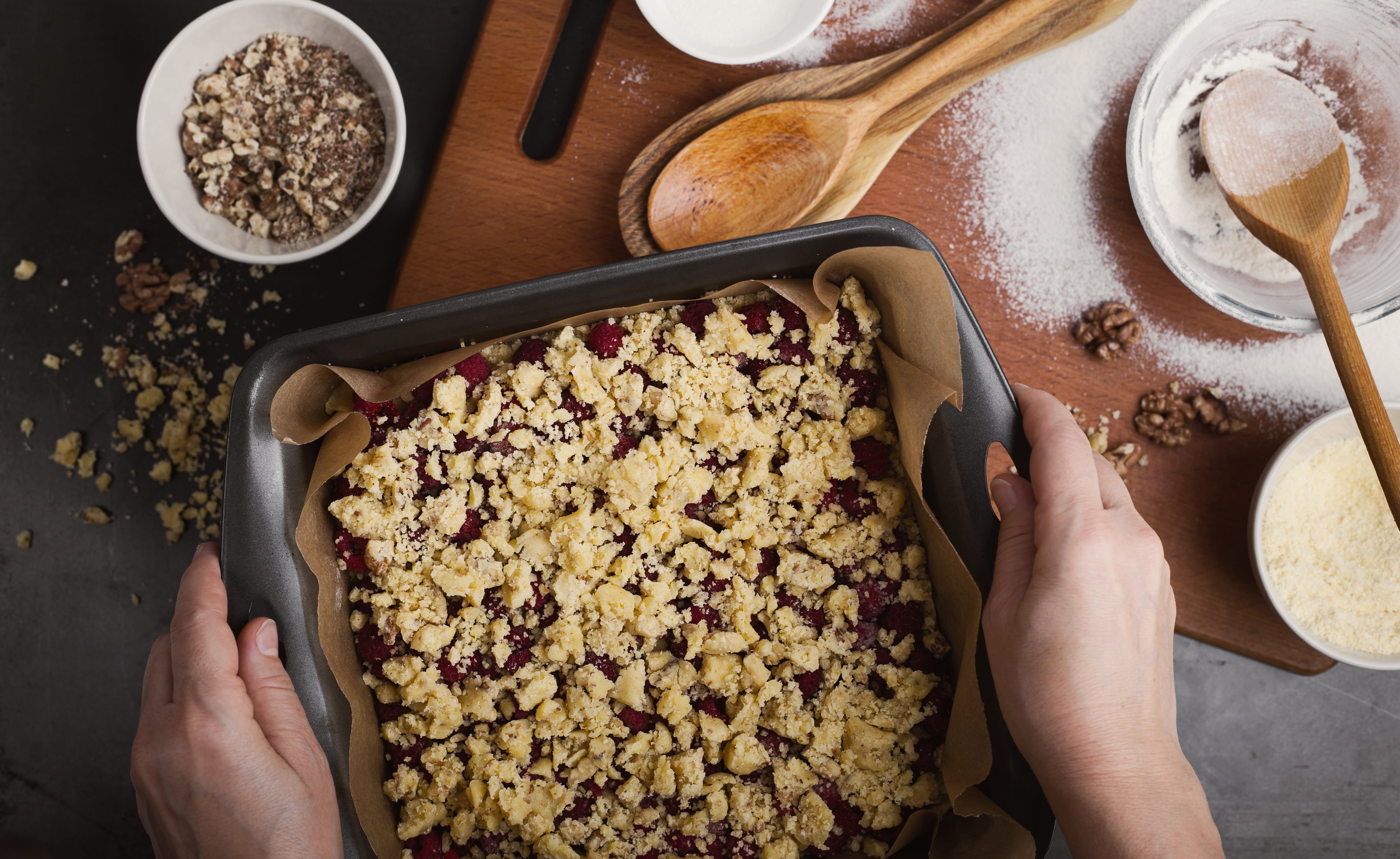 - Für die Streusel Mehl, Zucker, Zimt und Butter krümelig verkneten und darüberstreuen. Etwa 45 Minuten goldbraun backen. Nach dem Auskühlen mit Staubzucker bestäuben und in Stücke teilen.