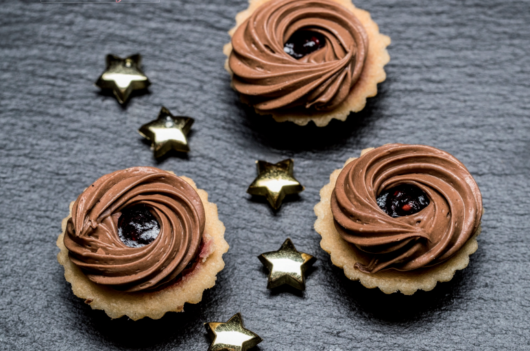 - Mürbteigschüsserl aus der Form heben, auskühlen lassen und bis zum Rand mit Himbeermarmelade füllen.