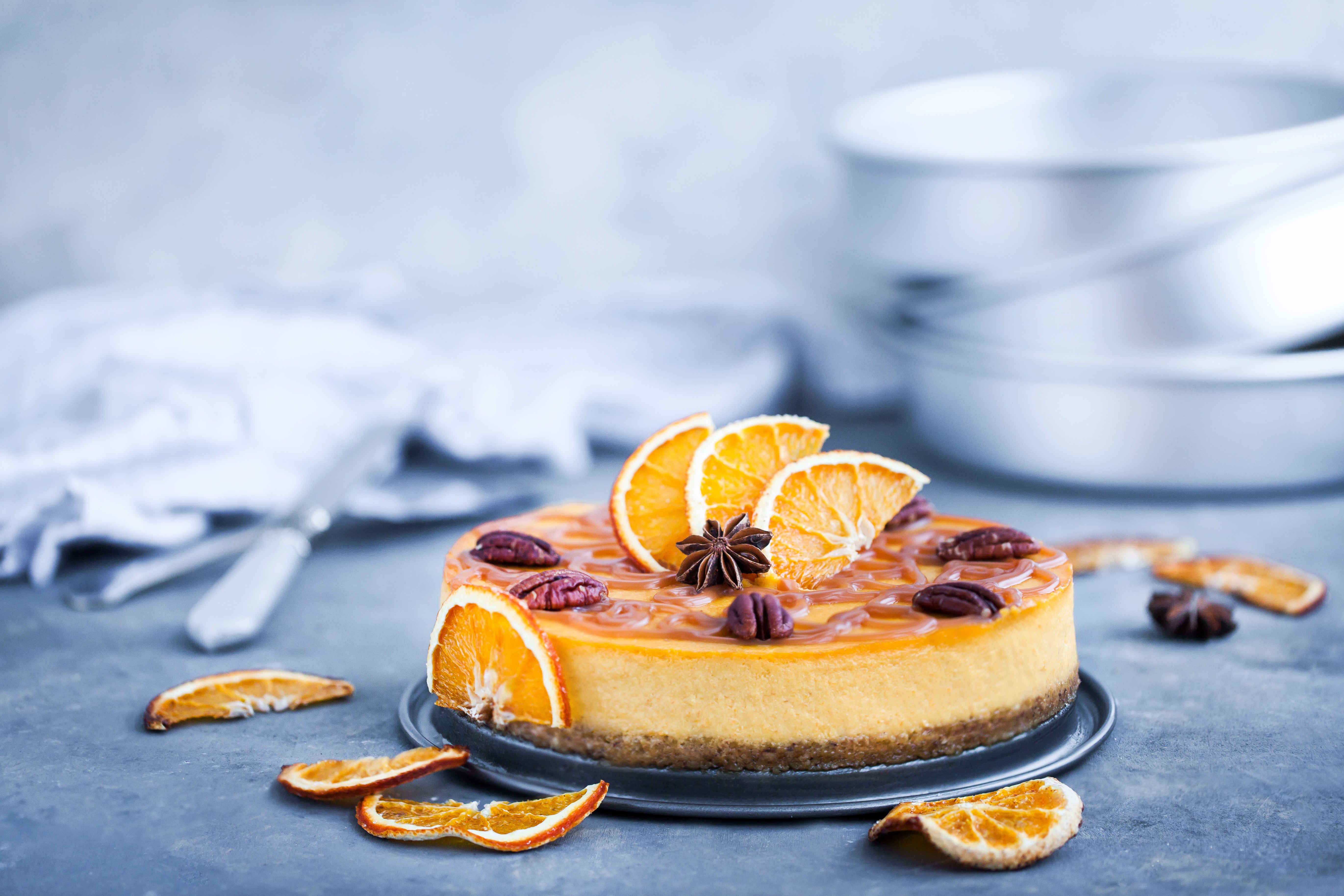 - 5. Zum Dekorieren die Orangen gründlich schälen und die Filets herausschneiden. Den Ahornsirup mit dem Orangenblütenwasser und Orangensaft verrühren und über den Kuchen träufeln. Mit den Orangenfilets belegen.