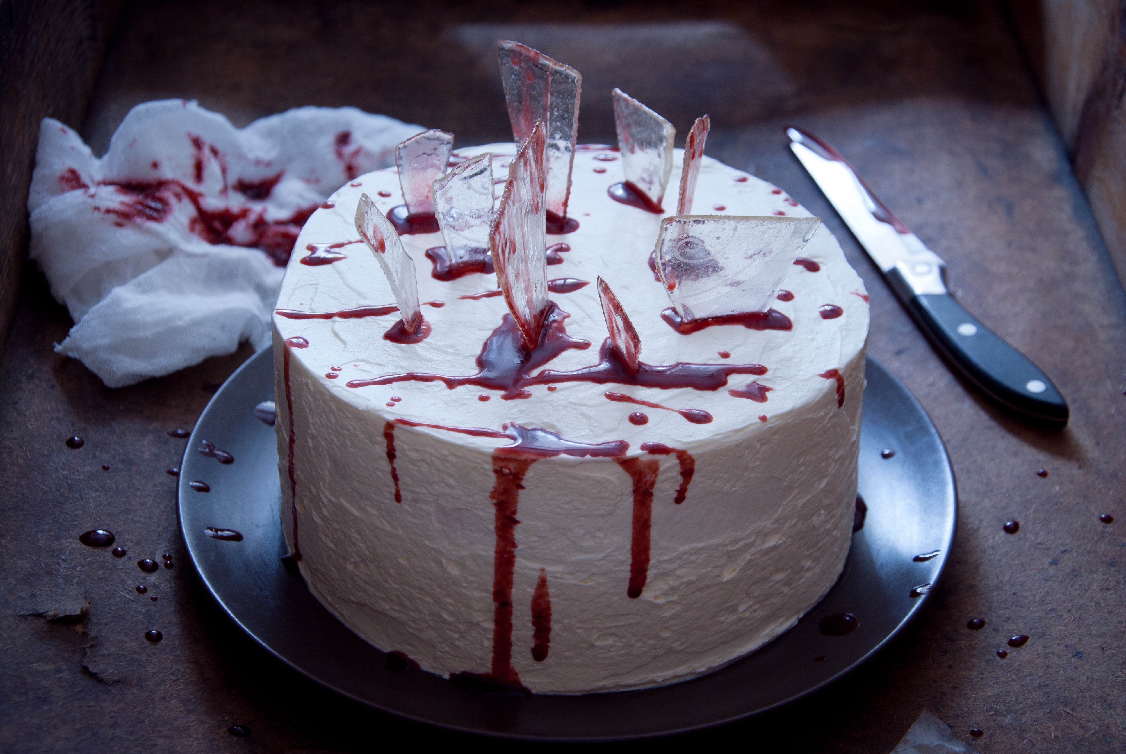 - Den Rollfondant auf einer mit Staubzucker bestäubten Arbeitsfläche entsprechend groß und knapp 1 cm dick ausrollen. Die Torte damit einkleiden, dann mit einem scharfen Messer einige Schnitte anbringen. Die restliche Buttercreme mit ein wenig Wasser verrühren und als ‚Blut‘ in die Schnitte streichen.