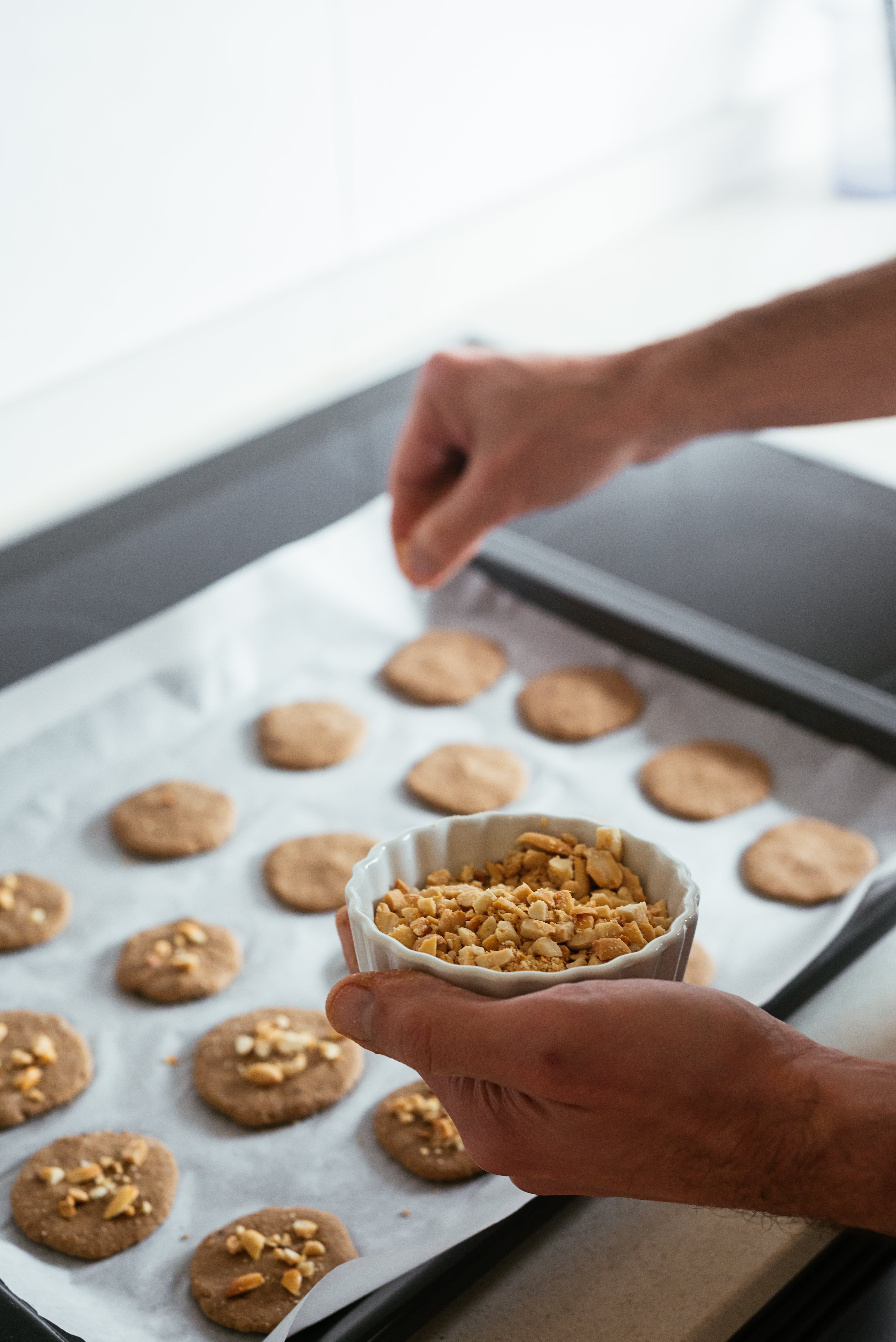 - Die Masse auf einer mit Staubzucker bestreuten Arbeitsfläche circa 1,2 cm dick ausrollen und 3,5 cm große, runde Kekse ausstechen.