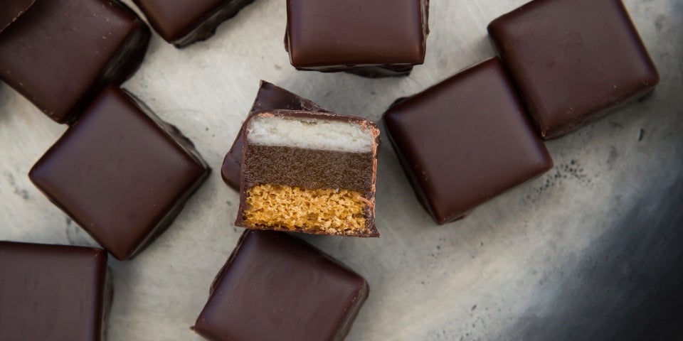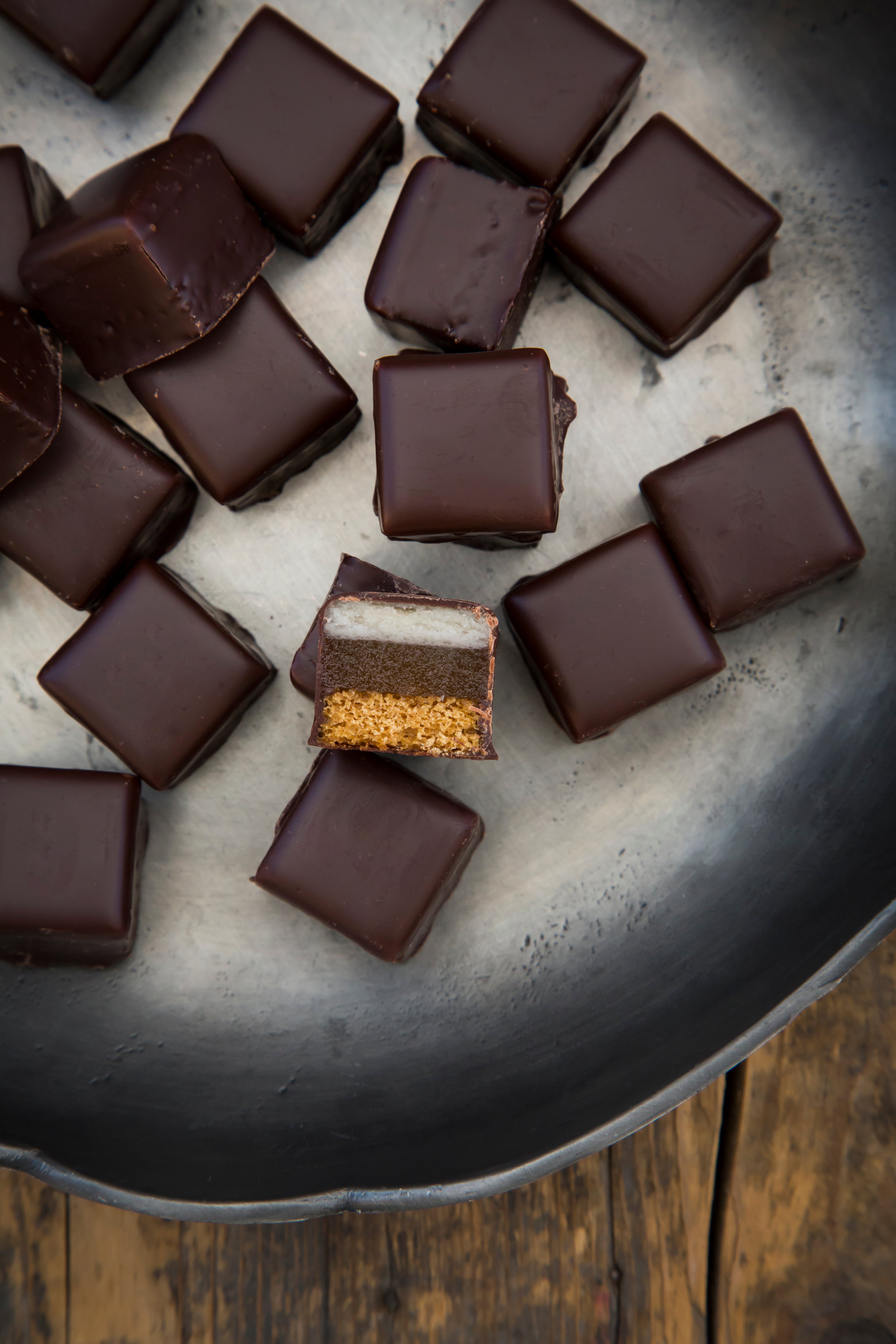 - Dann den Kuchen in etwa 7 x 7 gleichmäßige Quadrate schneiden. Die gehackte Kuvertüre über einem heißen Wasserbad schmelzen lassen und darin die Dominosteine wenden (am besten mit einer Pralinengabel). Auf einem Gitter abtropfen und fest werden lassen. Nach Belieben mit Zuckerguss verzieren und mit Zucker bestreuen.