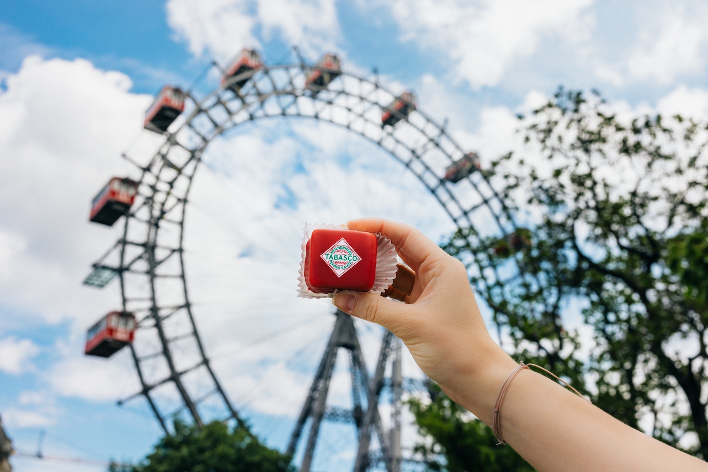 Der rosarote Punschkrapfen zählt zu Wien, wie die Fiaker, der Steffl und das Riesenrad. Und genau vor diesem wurde das Kult-Dessert nun mit einem Logo abgelichtet, das einen zumindest zweimal hinsehen lässt. Auf der beliebten Mehlspeise ist nämlich das Logo des amerikanischen Saucenherstellers Tabasco zu finden. Eine Kreation, mit der so schnell niemand gerechnet hätte.