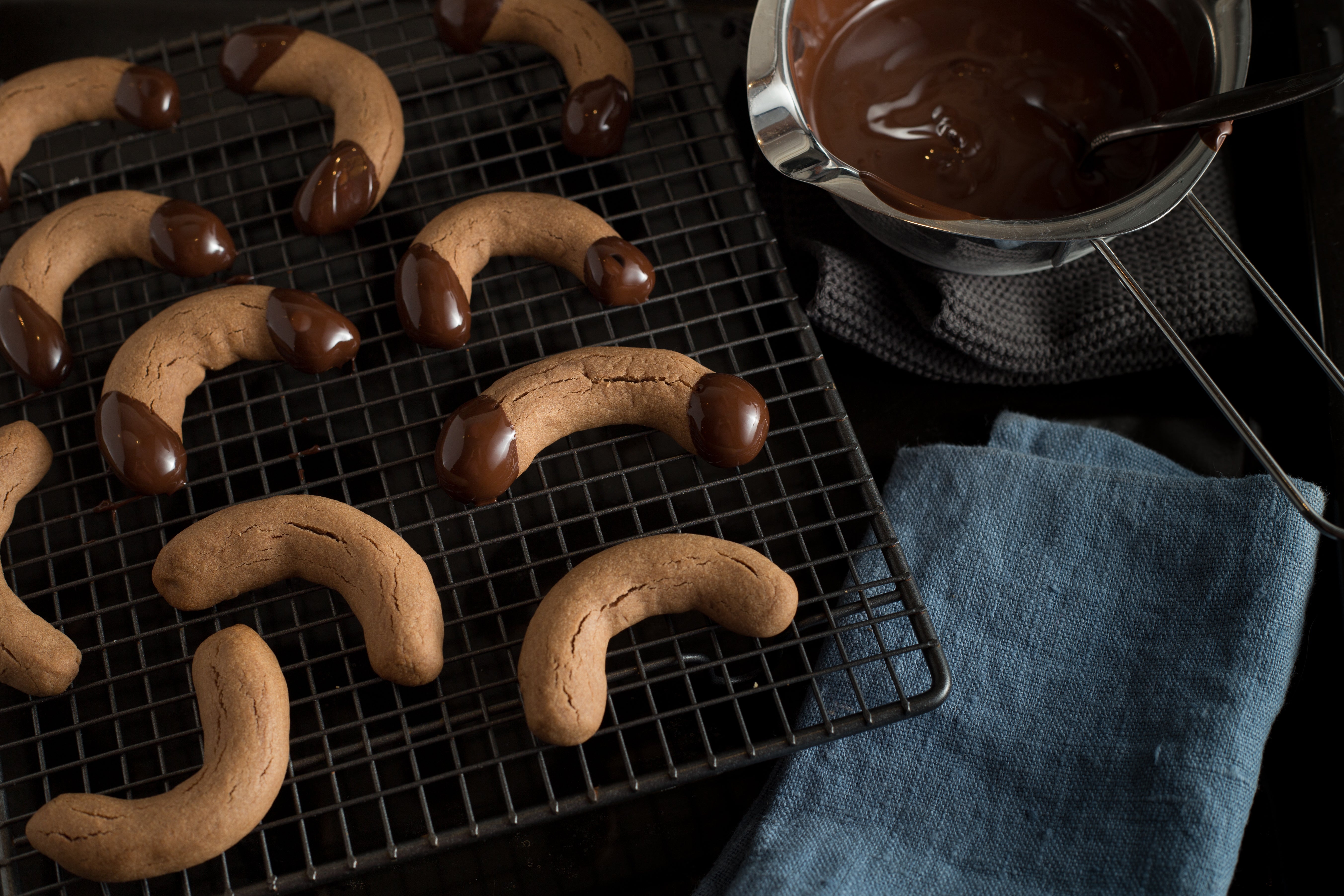 - Die Kuvertüre im Wasserbad schmelzen, temperieren und die Kipferl mit den Spitzen in die Kuvertüre tauchen. Auf dem Kuchengitter oder einem Stück Alufolie ablegen zum Trocknen. Zum Aufbewahren in eine Dose legen.