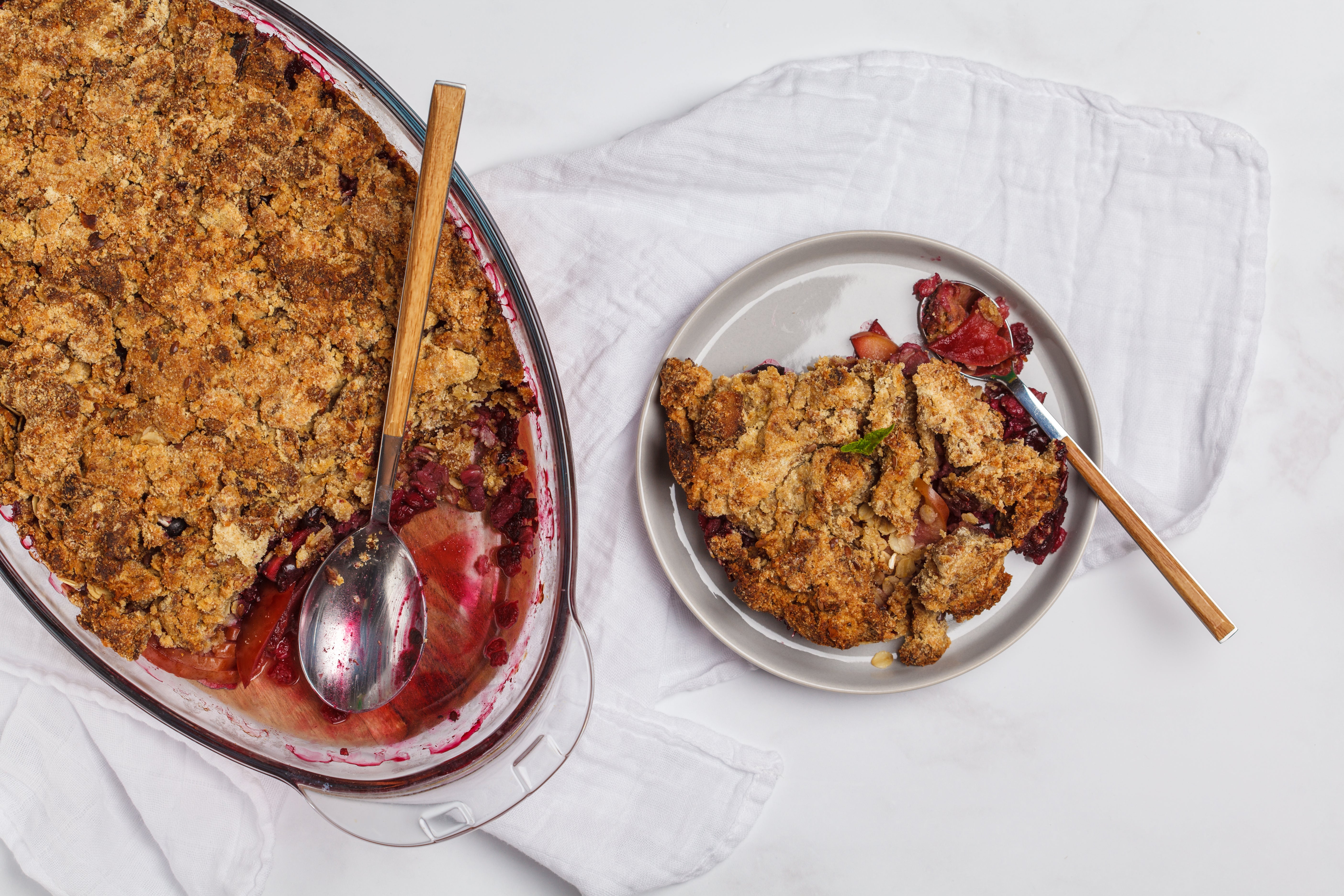 - Den Ofen auf 180 °C Ober- und Unterhitze vorheizen. Für die Streusel alle Zutaten krümelig vermengen. Über die Früchte streuen und das Crumble im Ofen ca. 35 Minuten goldbraun backen.