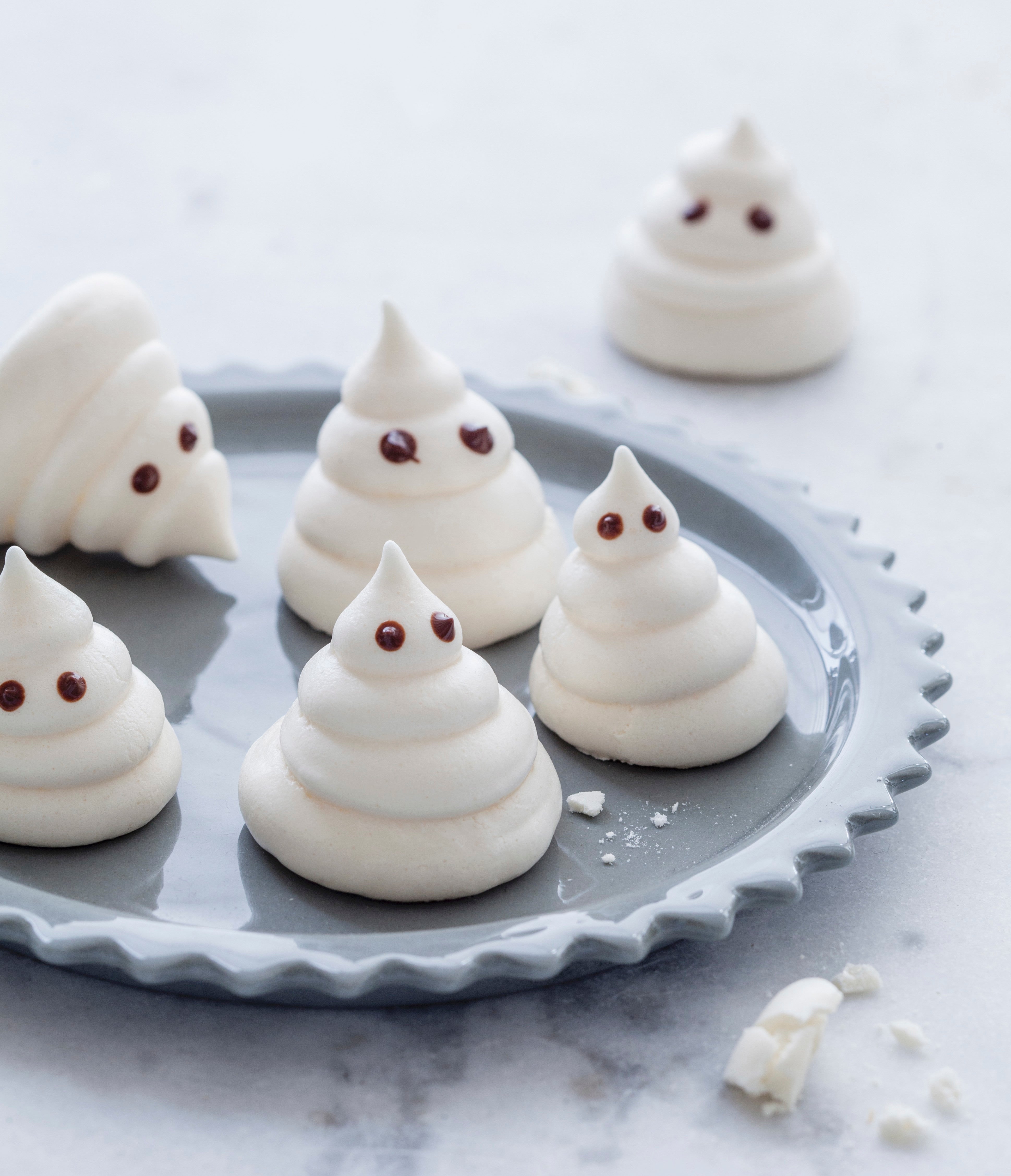2. In einen Spritzbeutel mit Lochtülle füllen und auf ein mit Backpapier belegtes Backblech kleine "Gespenster" aufspritzen. Im Ofen etwa 1 Stunde und 20 Minuten trocknen lassen.