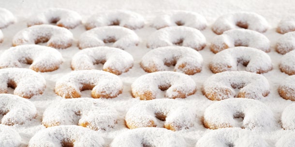 3 Eine Arbeitsfläche mit Mehl bestreuen. Teig zu 1,5 cm dicken Strängen rollen, davon circa 5 g schwere Stücke abschneiden und jedes Teigstück zu einem Kipferl formen (siehe Tipp). Kipferln auf ein mit Backtrennpapier belegtes Blech legen und im Backrohr bei 160 °C circa 15 Minuten backen (die Kipferln sollen an den Rändern goldbraun werden).