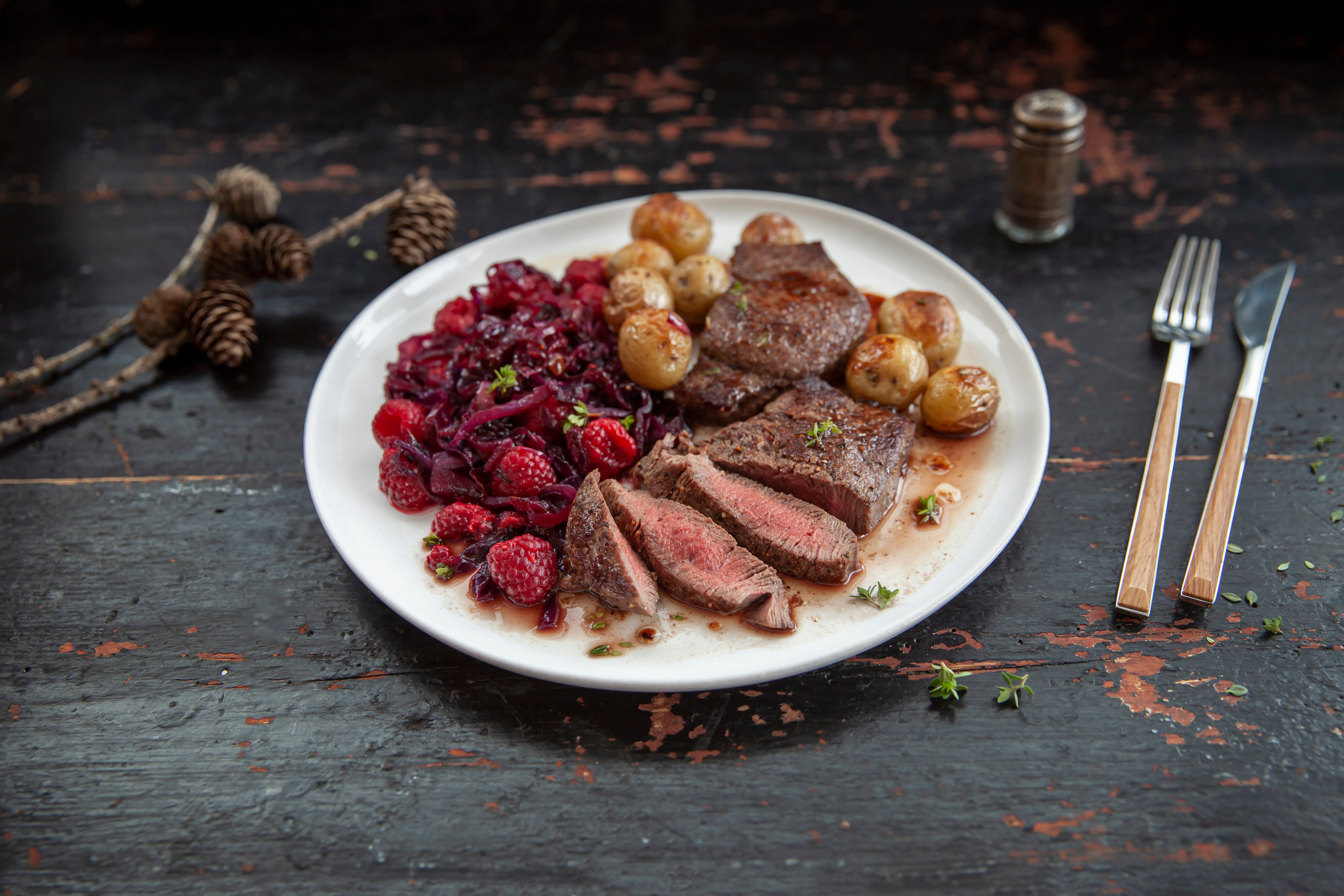 - HIRSCHKOTELETT: Hirschkotelett mit Salz und schwarzem Pfeffer würzen. In einer heißen Pfanne von beiden Seiten anbraten, herausnehmen und beiseitestellen. Butter in die Pfanne geben und Thymian, Rosmarin, Wacholderbeeren und Orangenabrieb kurz aufschäumen.Backofen auf 140 °C vorheizen. Das Hirschkotelett auf ein Gitter legen und mit der Kräuter-Orangenmischung bestreichen. Das Gitter auf ein Blech stellen und 12 bis 15 Minuten in den vorgeheizten Backofen schieben. Die Kerntemperatur soll 49 °C betragen. Das Fleisch vor dem Aufschneiden noch 5 Minuten ruhen lassen. Die Koteletts mit grobem Salz und Pfeffer bestreuen.
