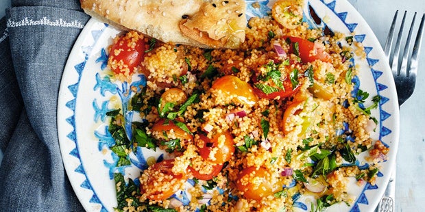 Dauer: 30 min Schwierigkeit: leicht Portionen: 4 Zutaten 1/2 Zitrone, Saft 1 TL Paradeismark 4 EL Olivenöl Salz, Pfeffer, aus der Mühle ca. 60 ml kalter Gemüsefond 150 g Couscous 250 g Kirschparadeiser, rot und gelb 1 rote Zwiebel 2 Handvoll Petersilie 1 Handvoll Minze Zubereitung 1. Den Zitronensaft, das Paradeismark, Öl, Salz, Pfeffer und den Fond in einer Schüssel verquirlen. Den rohen Couscous dazugeben, vermengen und über Nacht abgedeckt im Kühlschrank ziehen lassen. 2. Die Paradeiser waschen und halbieren. 3–4 Paradeiser mit einer Gabel zerdrücken und zusammen mit den übrigen Paradeisern zum Couscous geben. Die Zwiebel häuten und fein würfeln. Die Petersilie und die Minze abbrausen, trocken schütteln und die Blätter hacken. Alles unter den Couscous heben und mit Salz sowie Pfeffer abschmecken.