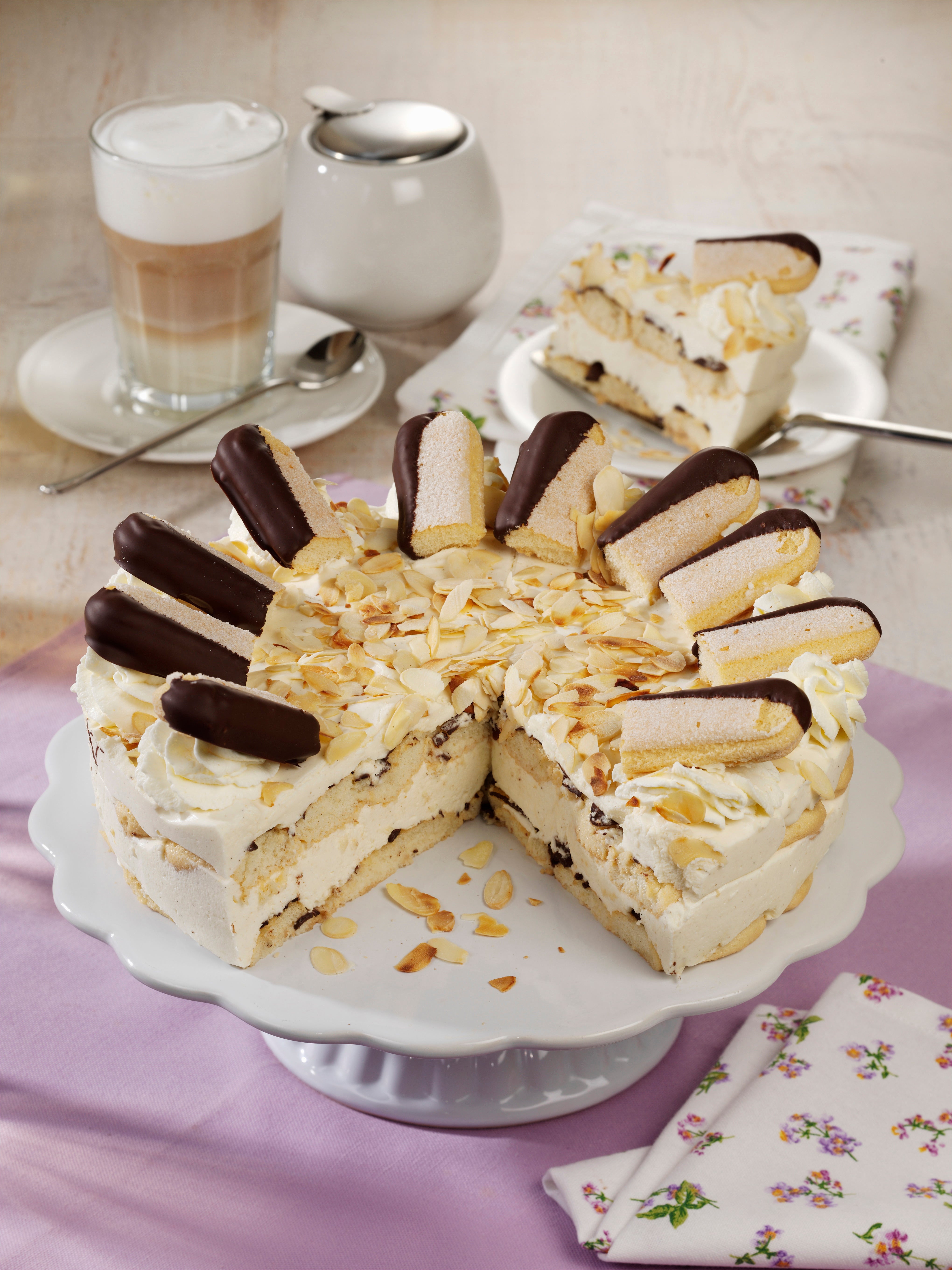 4. Weiter so verfahren, bis alles aufgebraucht ist. Für ca. 4 Stunden kalt stellen. Aus der Form lösen. Das Obers steif schlagen und die Torte dünn damit einstreichen. Den Rest des Obers auf der Torte verteilen. Mittig mit übrigen Keksen toppen.