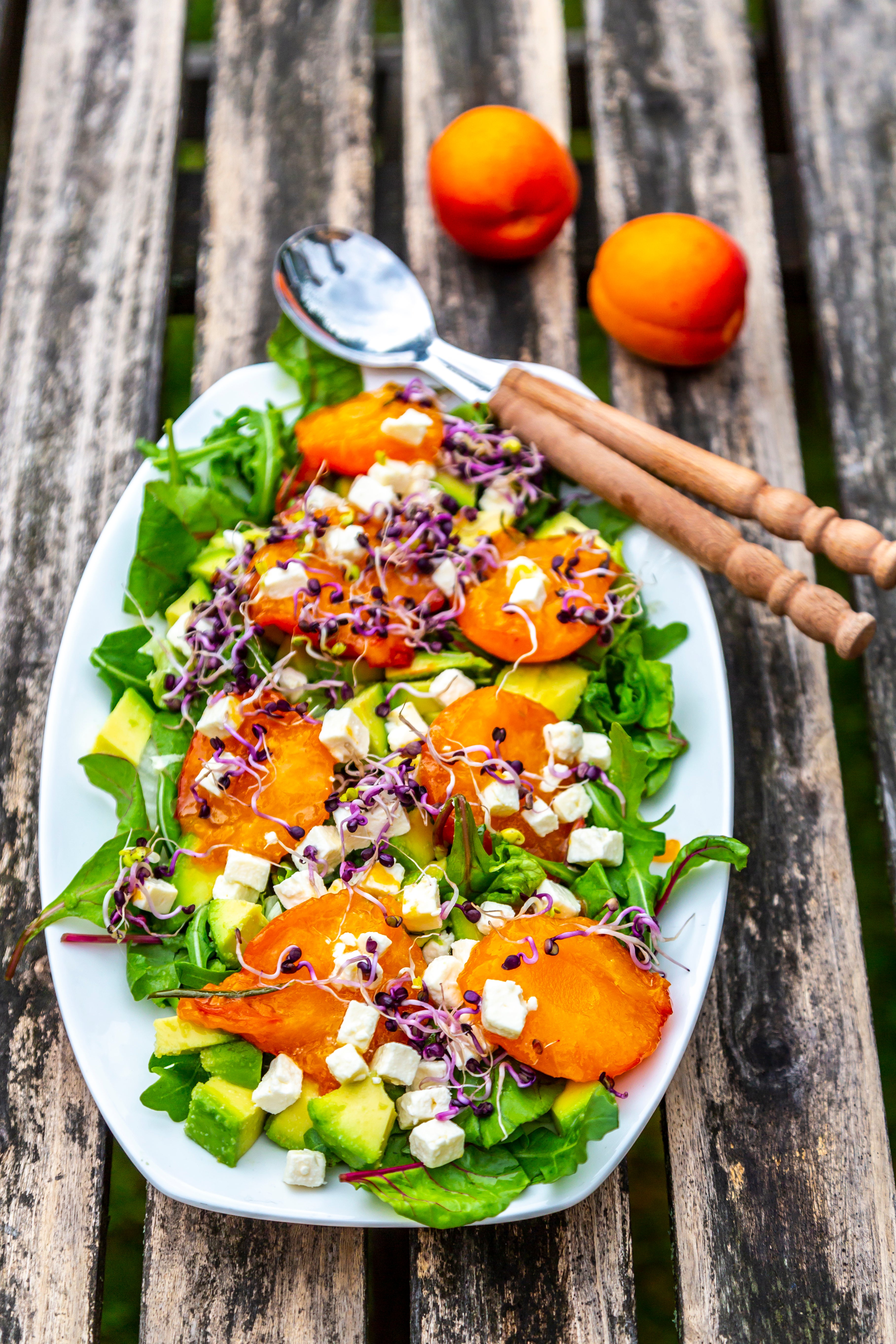 - Den Rucola und die Salatblätter auf Teller verteilen. Paprika, Kirschparadeiser, Marillenspalten und Feta darauf verteilen. Den Zitronensaft mit dem Essig, Salz und Pfeffer verrühren. Das Olivenöl kräftig unterschlagen.