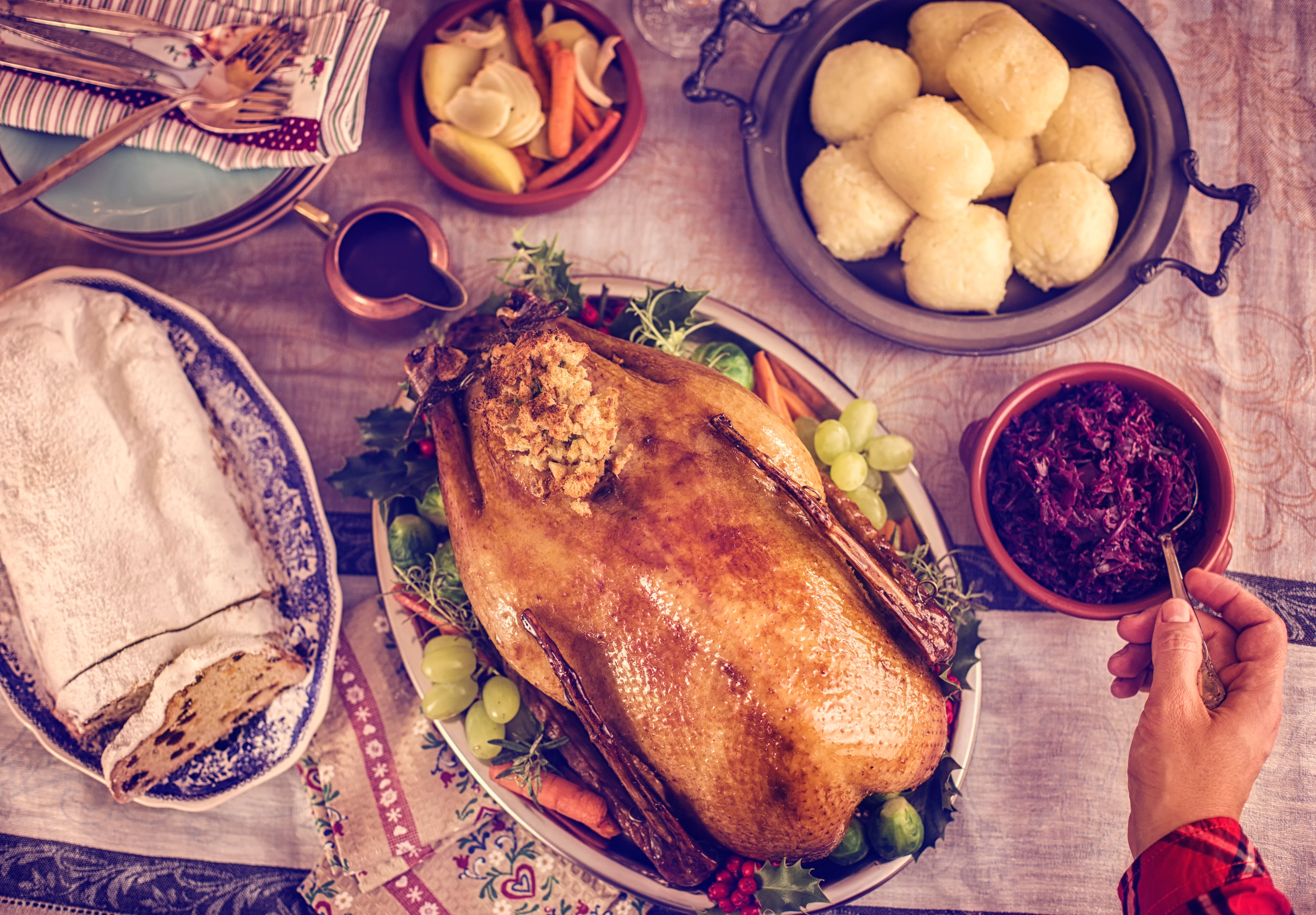 9. Die Sauce mit Salz und Pfeffer würzen und nach Belieben mit der kalt angerührten Stärke binden. Die Gans servieren, das übrige Rotkraut und die Sauce separat dazu reichen.