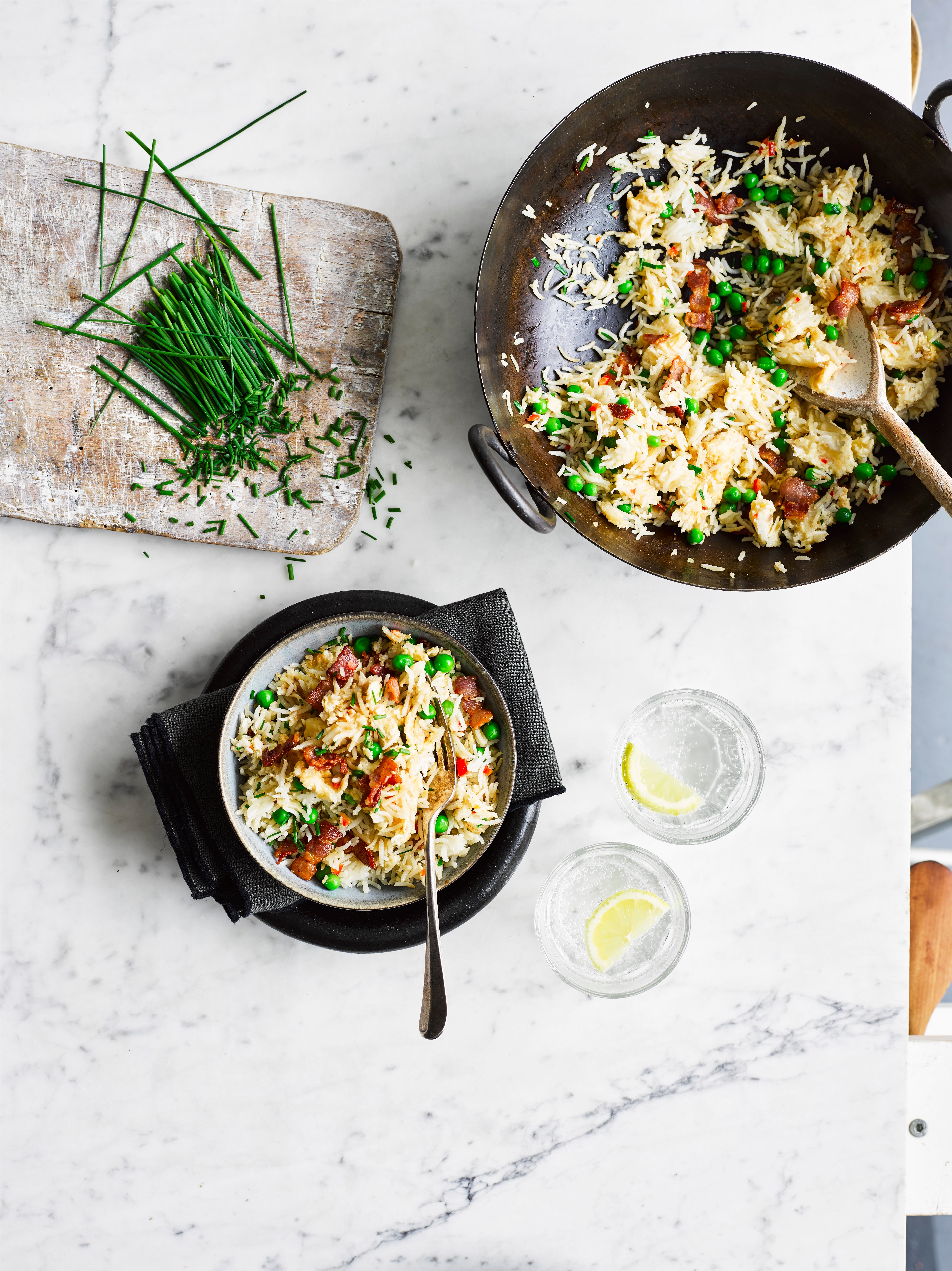 - Erbsen und Speck untermischen und weiter garen. Die Eier mit Sojasauce, Öl und Pfeffer verquirlen, über den Reis gießen und alles unter Rühren weiter braten, bis die Eier gestockt sind. Den gebratenen Reis abschmecken, in Schalen oder tiefen Tellern anrichten und mit Schnittlauch bestreut servieren.