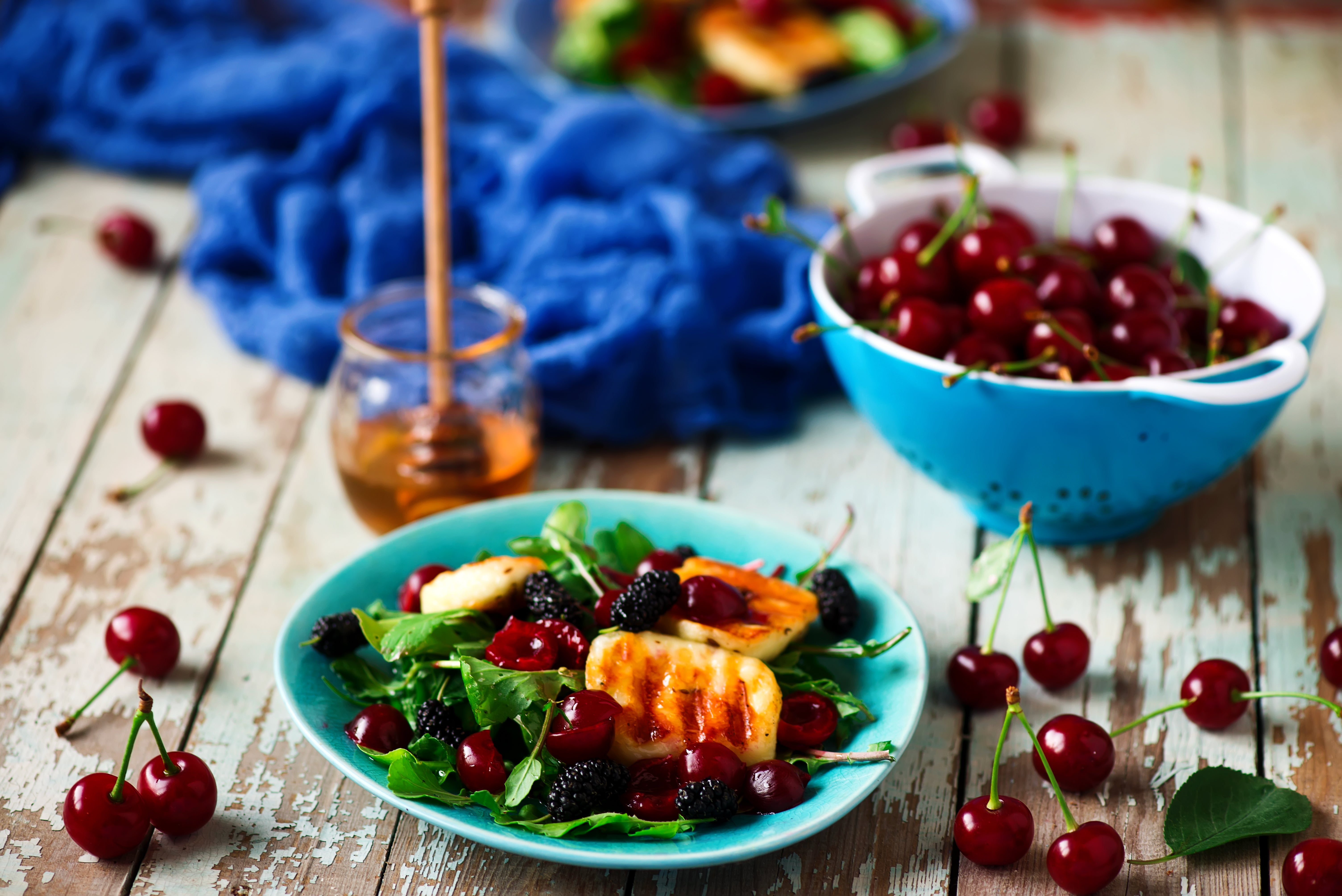 - Grillkäse auf eine Platte oder auf Tellern anrichten und mit Kirsch-Salsa toppen. Alles mit Pfeffer übermahlen, mit ein paar Tropfen Balsamicocreme beträufeln und mit Minze garniert servieren. Übrige Salsa separat dazu reichen.