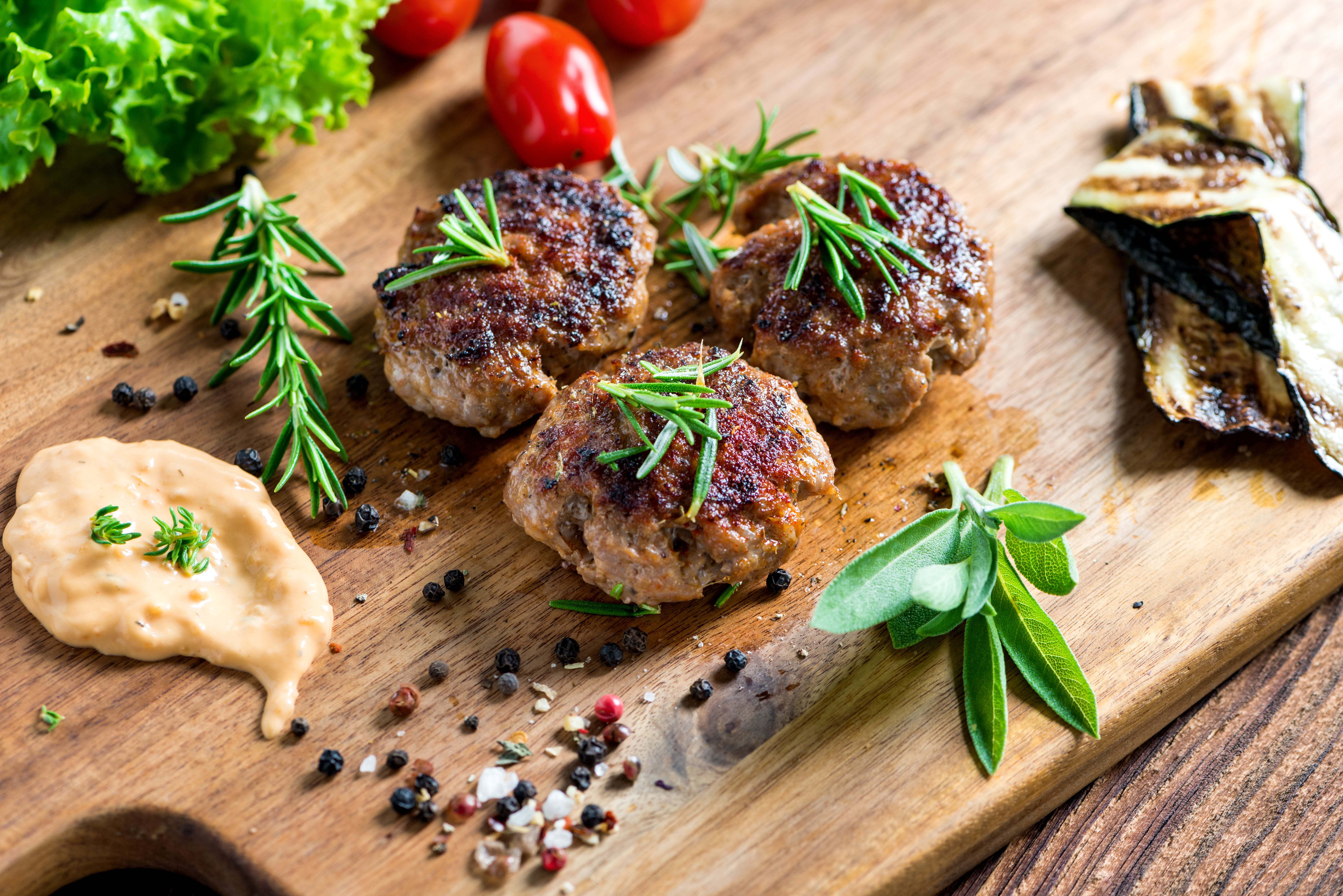 - In einer Pfanne das übrige Öl erhitzen, die Frikadellen darin von beiden Seiten kurz anbraten und leicht bräunen. Zwiebelspalten, Rosmarin und den restlichen Thymian mit in die Pfanne geben und die Frikadellen unter Wenden noch 5 - 8 Minuten garen, anschließend mit Pfeffer übermahlen und servieren.