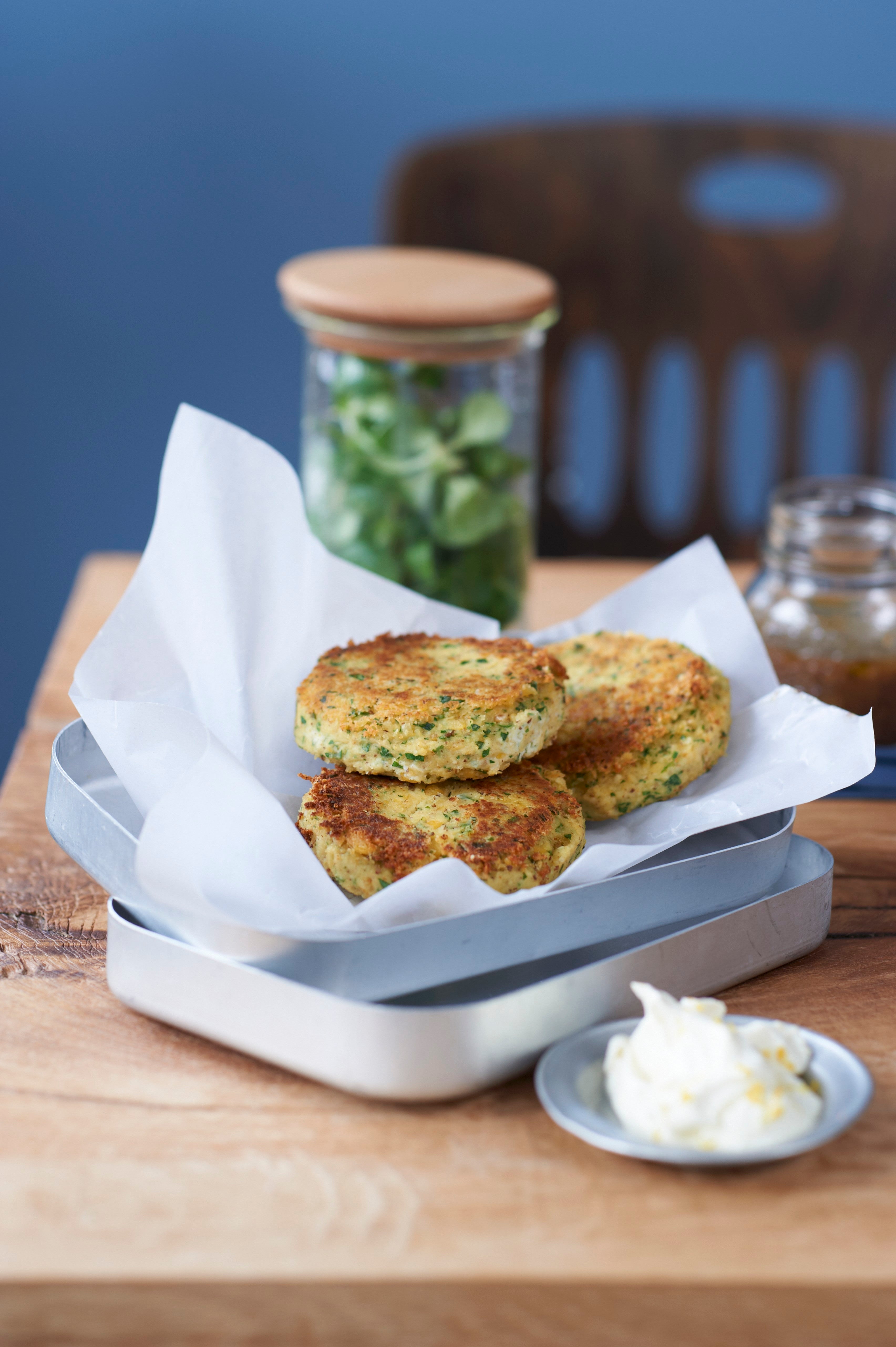 - Die Laibchen auf einer Platte anrichten. Brunnenkresse waschen, trockenschütteln und dazwischen verteilen. Mit dem Dip und Zitronenspalten servieren.