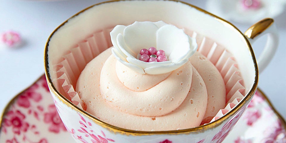 8. Die Buttercreme in einen Spritzbeutel mit Lochtülle geben und Spiralen auf die Muffins spritzen. Mit Zuckerblüten garnieren. Die Cupcakes in Tassen platzieren und servieren.