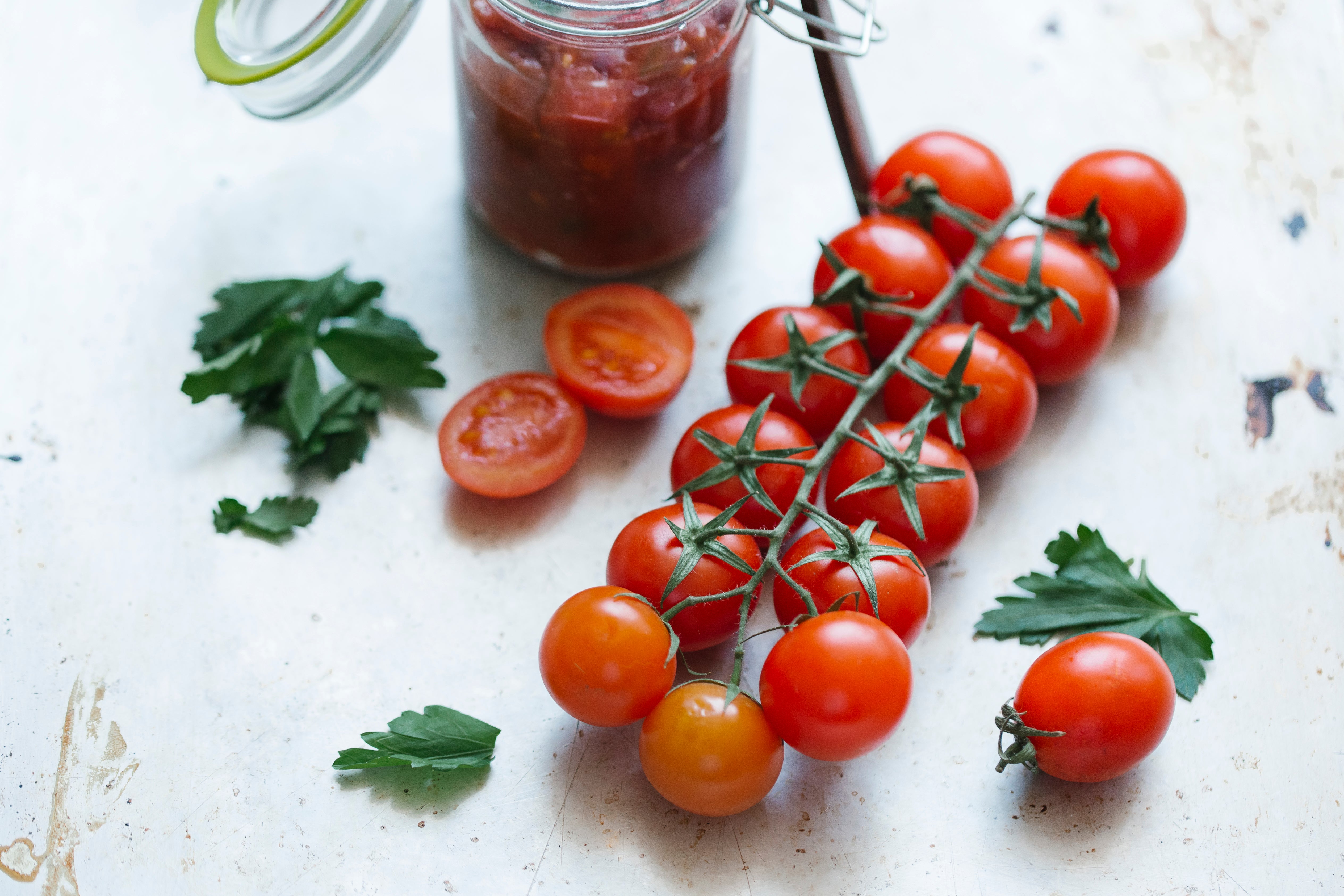 2. In einem Topf im Olivenöl 4-5 Minuten andünsten. Den Orangensaft zugeben, leicht salzen, mit Cayennepfeffer würzen und etwas einreduzieren lassen. Die Tomaten zusammen mit 3-4 EL Wasser ergänzen. Das Ganze für ca. 10 Minuten bei milder Hitze köcheln lassen. Den Gelierzucker zügig einrühren und alles weitere 5 Minuten sprudelnd kochen lassen. In ein Glas (ca. 400 ml) füllen und auskühlen lassen.