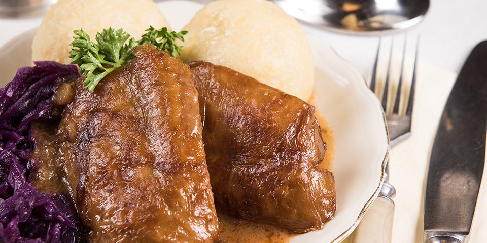 Vegane Martinigans mit Kartoffelknödel, Rotkraut und Bratensauce