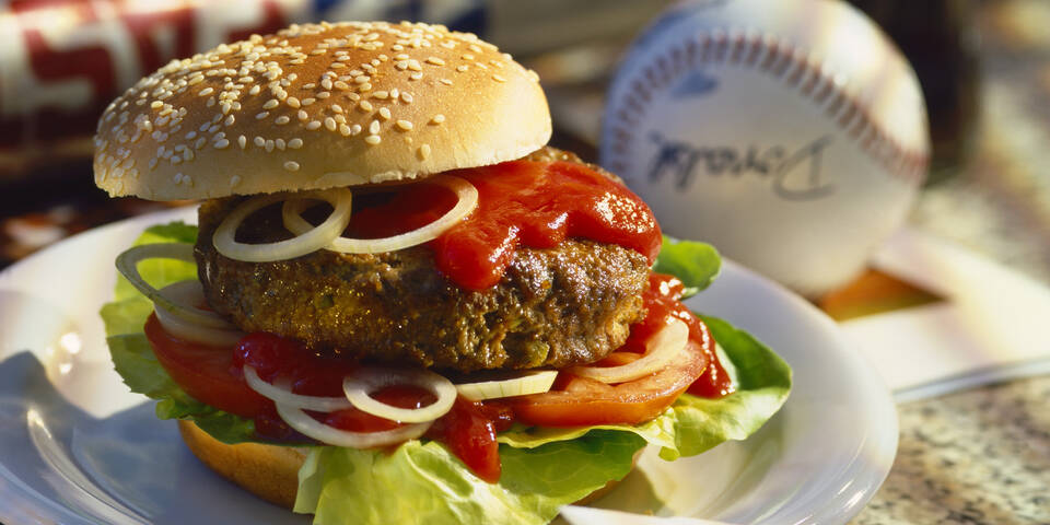 Die Brötchenunterseiten mit Senf bestreichen, mit Salat, Tomaten, einigen Zwiebelringen und Fleischlaibchen belegen. Je ein bisschen Ketchup darauf geben, darüber die übrige Zwiebelringe verteilen und mit der zweiten Brötchenhälfte belegt servieren.