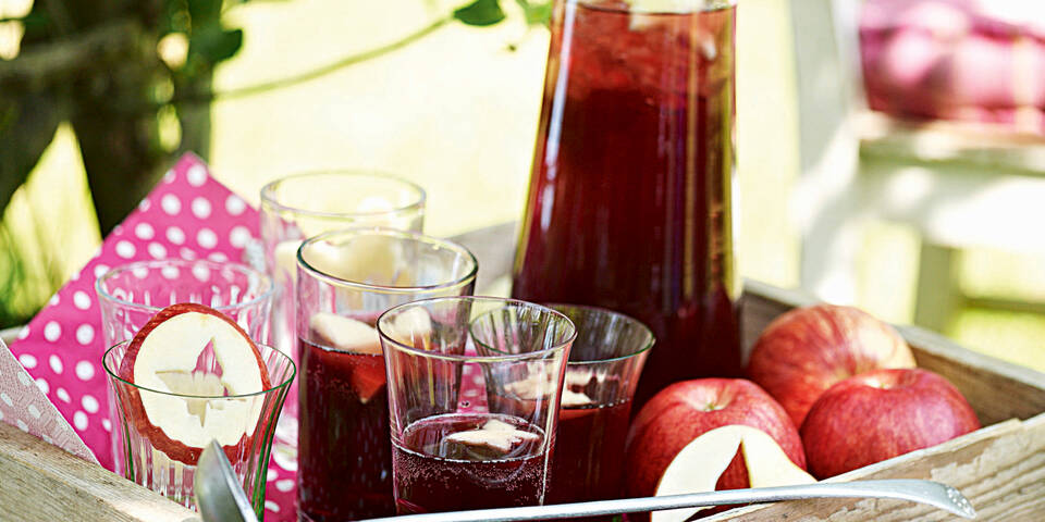 - Den Apfel waschen, in Scheiben schneiden und daraus Sommermotive (z. B. Schmetterlinge) mithilfe eines Plätzchenausstechers formen. Auf die Gläser verteilen und in eine Karaffe füllen.