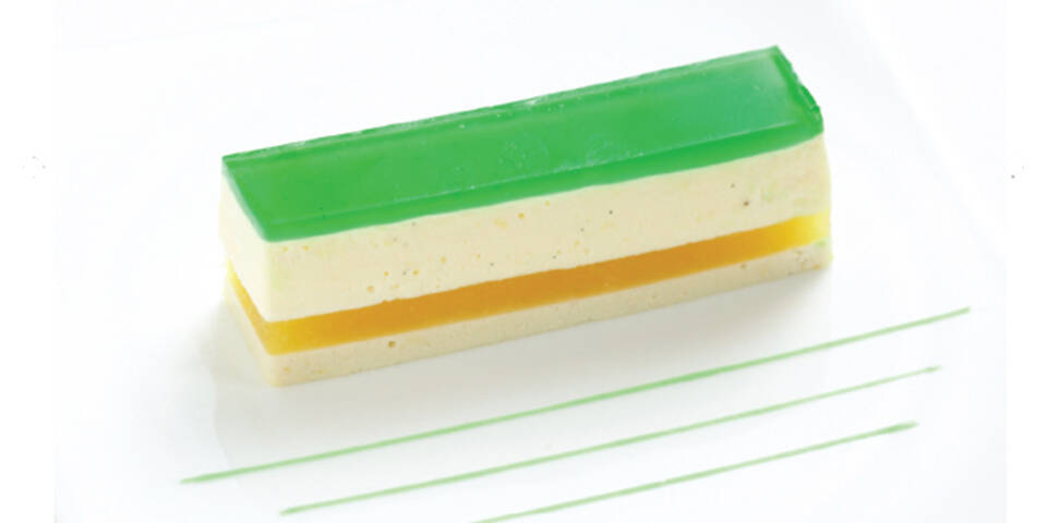 Für das Apfelmousse Ingwer und Zitronengras schälen und fein schneiden. Äpfel entkernen, schälen und achteln. Alle Zutaten bis auf die Gelatine kochen, bis die Äpfel weich sind. Äpfel pürieren, Masse durch ein Sieb streichen. Pro 100 g Apfelmasse ein Blatt Gelatine in kaltem Wasser einweichen. Gelatine ausdrücken und im warmen Apfelmousse auflösen. Apfelmousse auskühlen lassen und auf die Marzipanmasse streichen. Für das Apfelgelee Ingwer und Zitronengras schälen und in dünne Scheiben schneiden. Äpfel entkernen, schälen und achteln. Alle Zutaten (2 cm Ingwer, 1 Stange Zitronengras, 2 Äpfel, 0.3 l Weißwein, 100 g Zucker, Saft von 1/2 Zitrone, 3 cm Zimtstange, 1 Vanilleschote, 1 Sternanis) mit Ausnahme der Gelatine in einen Topf geben. Äpfel weich kochen. Flüssigkeit durch ein Sieb gießen. Pro 100 g Apfelfond ein Blatt Gelatine in kaltem Wasser einweichen. Gelatine ausdrücken und im warmen Apfelfond auflösen. Apfelgelee mit Lebensmittelfarbe färben und auf das abgekühlte Apfelmousse gießen.