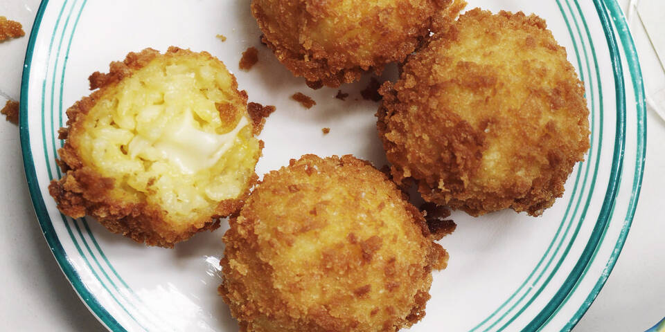 - Vom abgekühlten Reis etwa walnussgroße Portionen abnehmen und Kugeln daraus formen. Mit dem Finger eine Vertiefung in die Mitte drücken, einige Käsewürfel hineinfüllen und wieder zu einer Kugel formen. Anschließend die Bällchen im Mehl wenden, durch das Ei ziehen und zum Schluss mit den Semmelbröseln panieren.