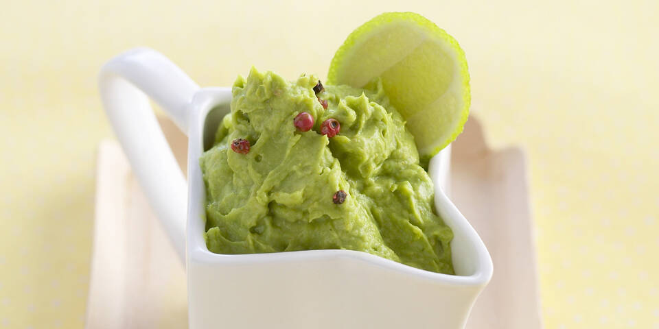 - Die Creme mit Salz abschmecken und auf 4 kleine Schalen verteilen. Je mit einem Limettenstück und 3–4 Pfefferbeeren garnieren.